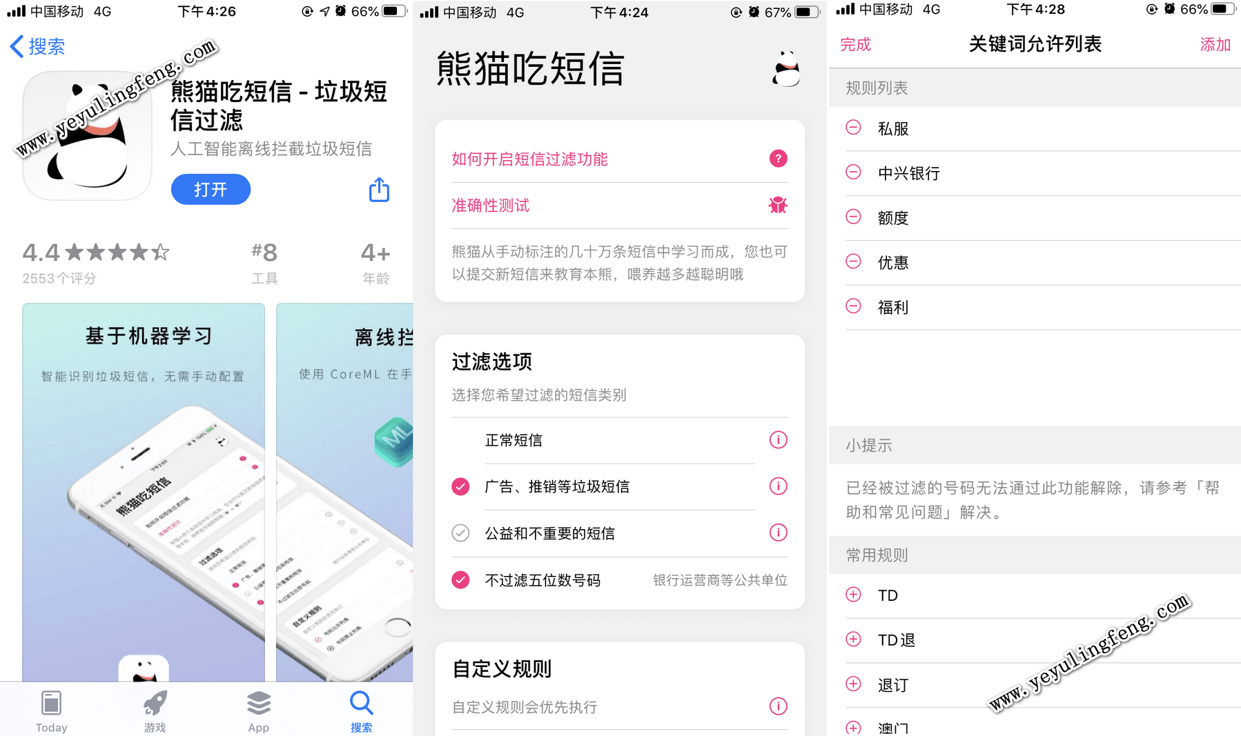 熊猫吃短信不会收集您的任何信息,更不会上传您的短信内容,如果您足够细心就会发现熊猫都不会请求网络权限,完全离线运行。目前售价3元体验还行使用iPhone手机的用户可以考虑一下,去年还有一次限免活动可惜没赶上。拦截功能目前对中文过滤良好,英文呢以及其他语言的消息可能就不那么管用了,不过好在能够不断学习与优化,再加上用户自行配置一些规则条件效果还是非常好的。