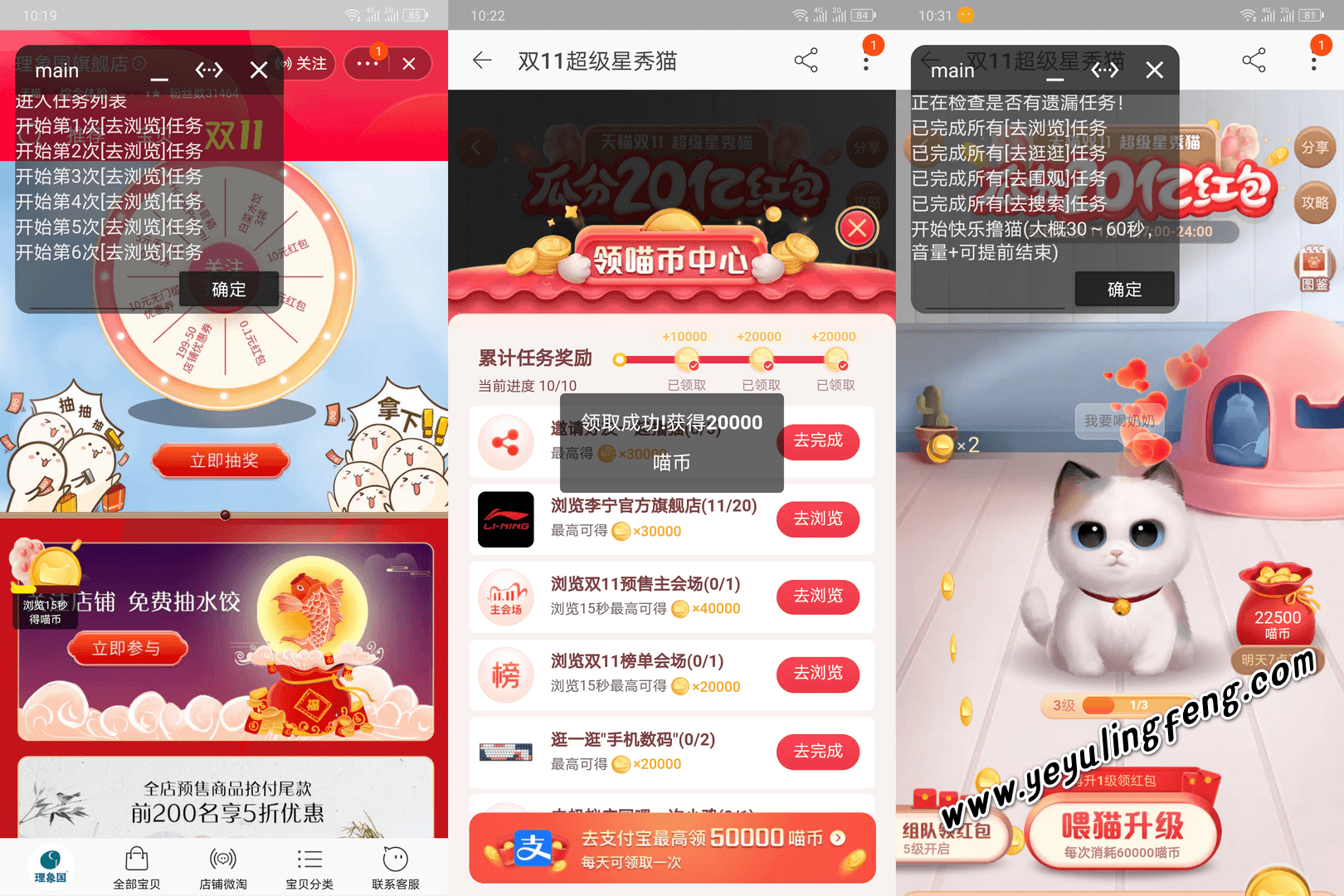 接着就是今年新出的超级星秀猫领喵币活动了,每天做任务领奖励大多数都是15秒的浏览商品时间,收集到的喵币可以用来给喵咪升级,最后就可以兑换双十一红包了。