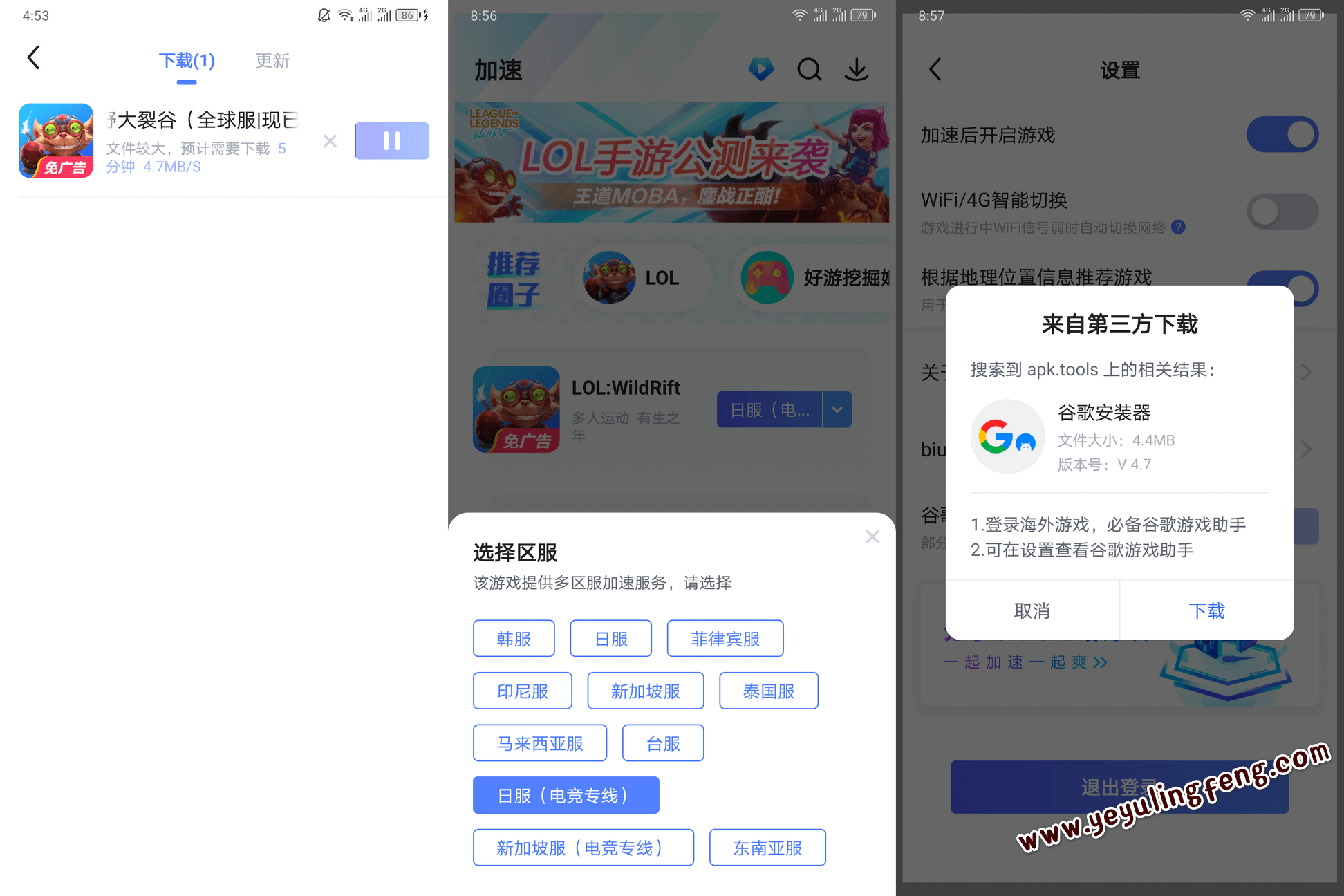 游戏帐号有了客户端也安装完毕剩下的就简单多了,由于国内无法直连游戏因此大家请用上面介绍的两款手游加速器的任意一款加速游戏即可,注册选择加速的区服要与你注册帐号的地区要一致。