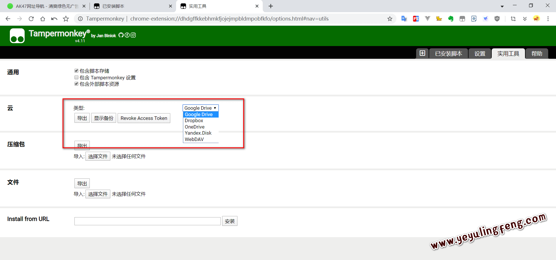 当然了如果换了电脑一般浏览器只会同步拓展插件并不会同步安装的脚本,因此我们需要手动备份脚本,而Tampermonkey管理面板——实用工具中就能进行云端同步,目前仅支持google以及oneDrive等国外网盘,有条件的小伙伴们可以同步下方便日后换电脑或者浏览器故障同步脚本数据。