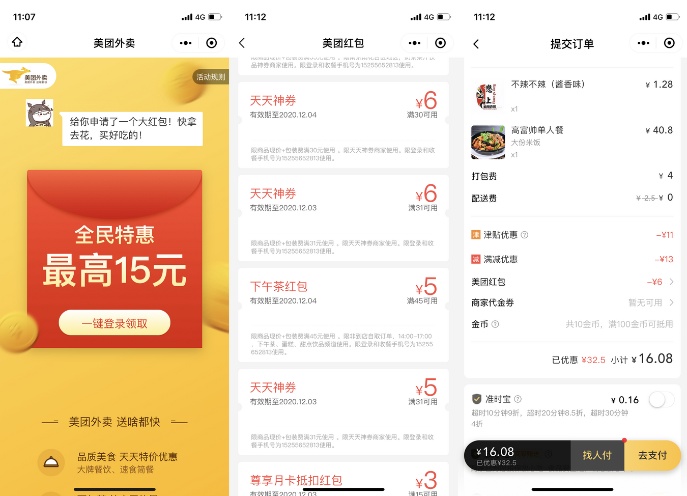 扫码领取红包后即可在微信内直接下单订外卖了,第一次金额比较大往后就稍微低点,但是苍蝇再小也是肉能省一点是一点。