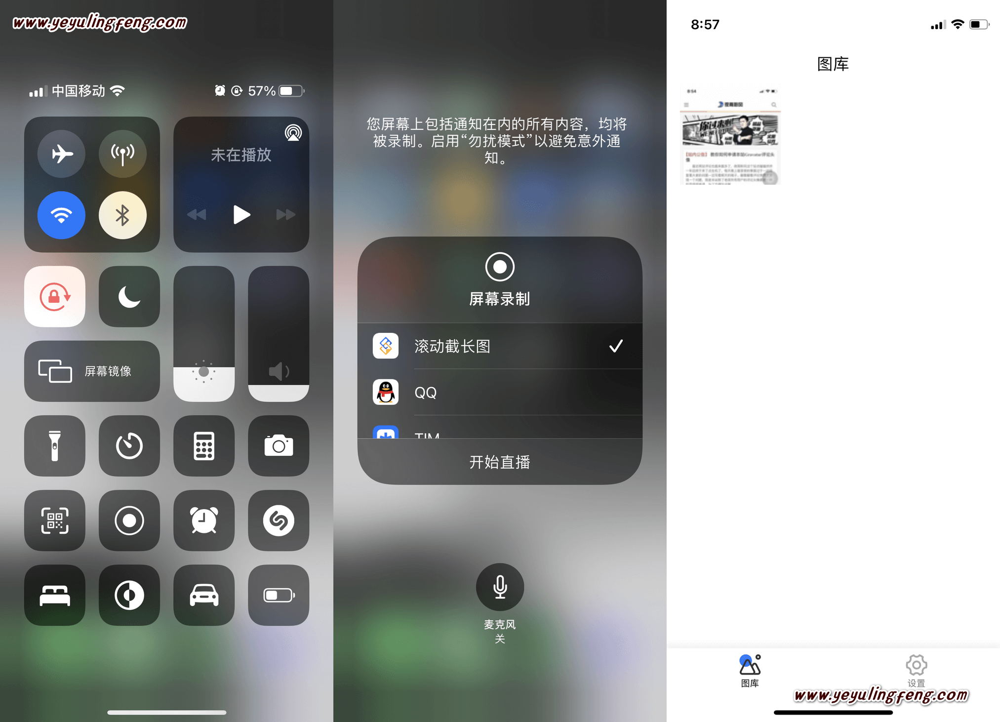 安装『滚动截长图』完毕后,进入到需要滚动截长屏的地方,呼出系统的控制中心,长按录屏按钮,在弹框中选中“滚动截长图”,最后点击开始直播,然后已最快的速度划出控制中心,倒计时结束后状态栏左上方会有提示,慢慢滚动屏幕即可开始自动截取了。