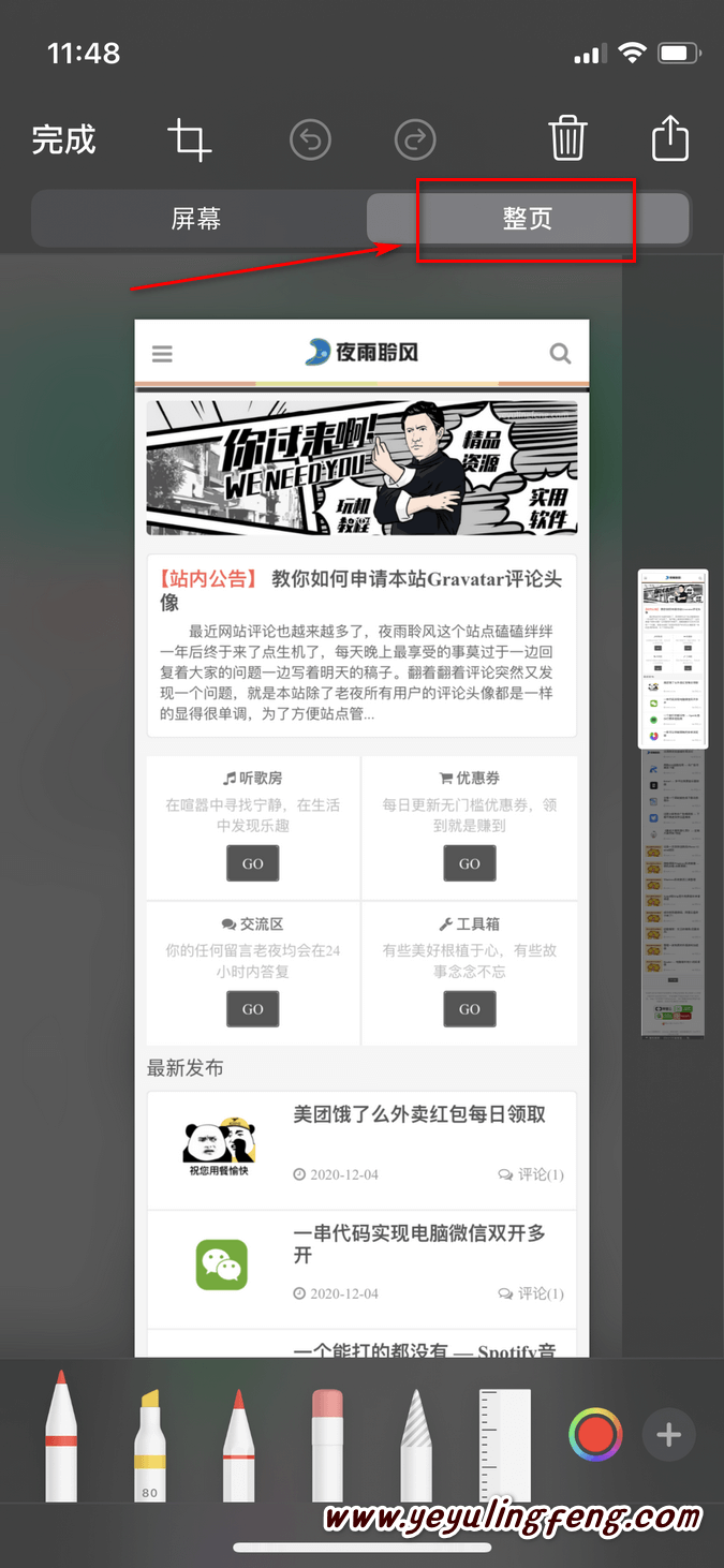 截图成功后左下角会出现一个预览的小窗口,点击进入,在点击顶部的“整页”进行滚动截屏操作了,最后点击左上方“完成”保存PDF文件至手机,到此Safari浏览器长网页截屏功能演示完毕!