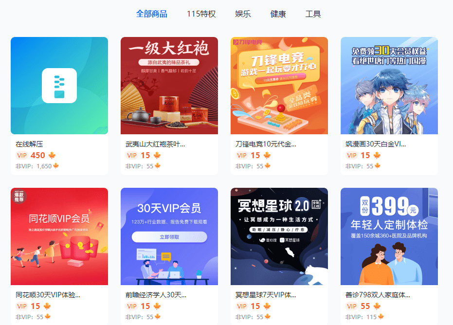 这个福利包有一个特别的赠送奖励是枫叶,枫叶可以干什么呢?进入115网盘“权益中心”,可以使用赠送的枫叶兑换其他产品,各类网盘VIP特权、热门App会员、体检和实用礼品,都可以免费兑换。
