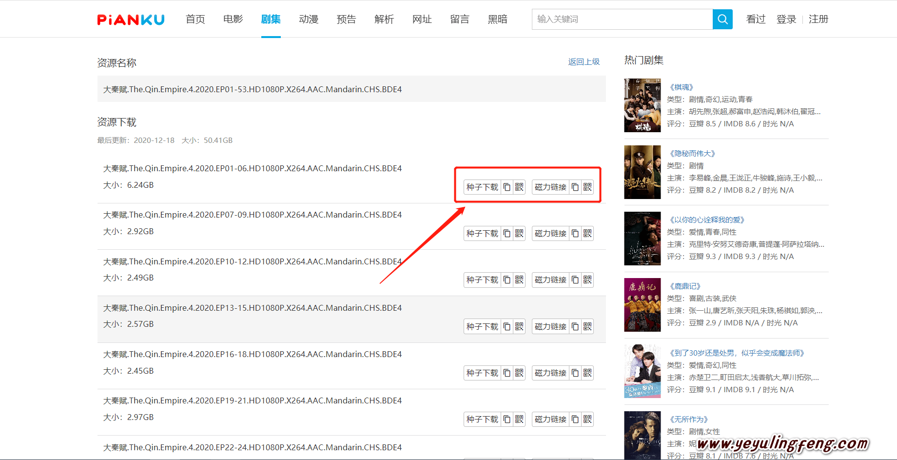 首先我们从上面提及到的资源网站合集中随便找一个资源网站,找一些近期热门的视频,复制页面上的Magnet链接