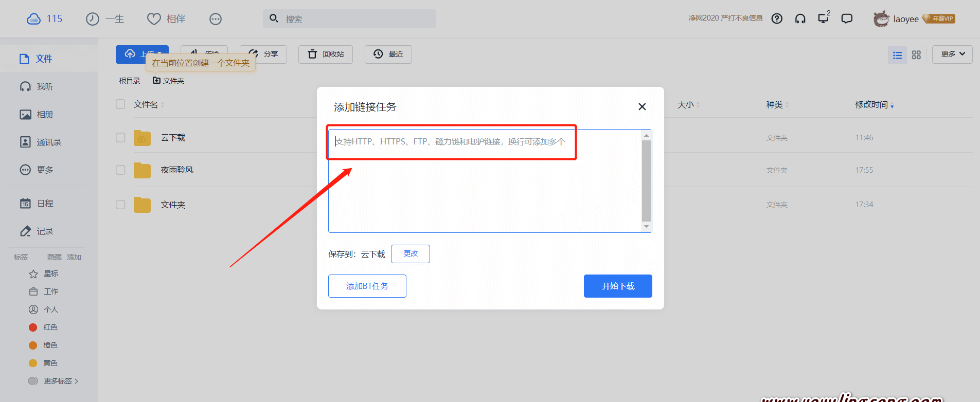 接着打开115网盘的客户端,鼠标移动到上传就会显示一个“链接任务”,点击后相信不少小伙伴们都直到接下来怎么做了,粘贴刚刚的Magnet链接直接开始下载