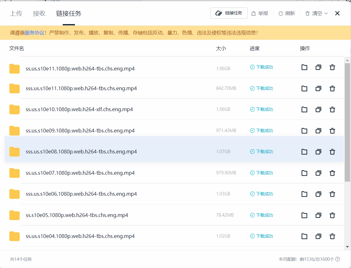 “链接任务”中的下载属于离线下载,不会消耗你的本地流量下载视频,而是通过115网盘服务器暂存了,基本上几个G的资料几秒中后就在网盘中的“云下载”目录里面了