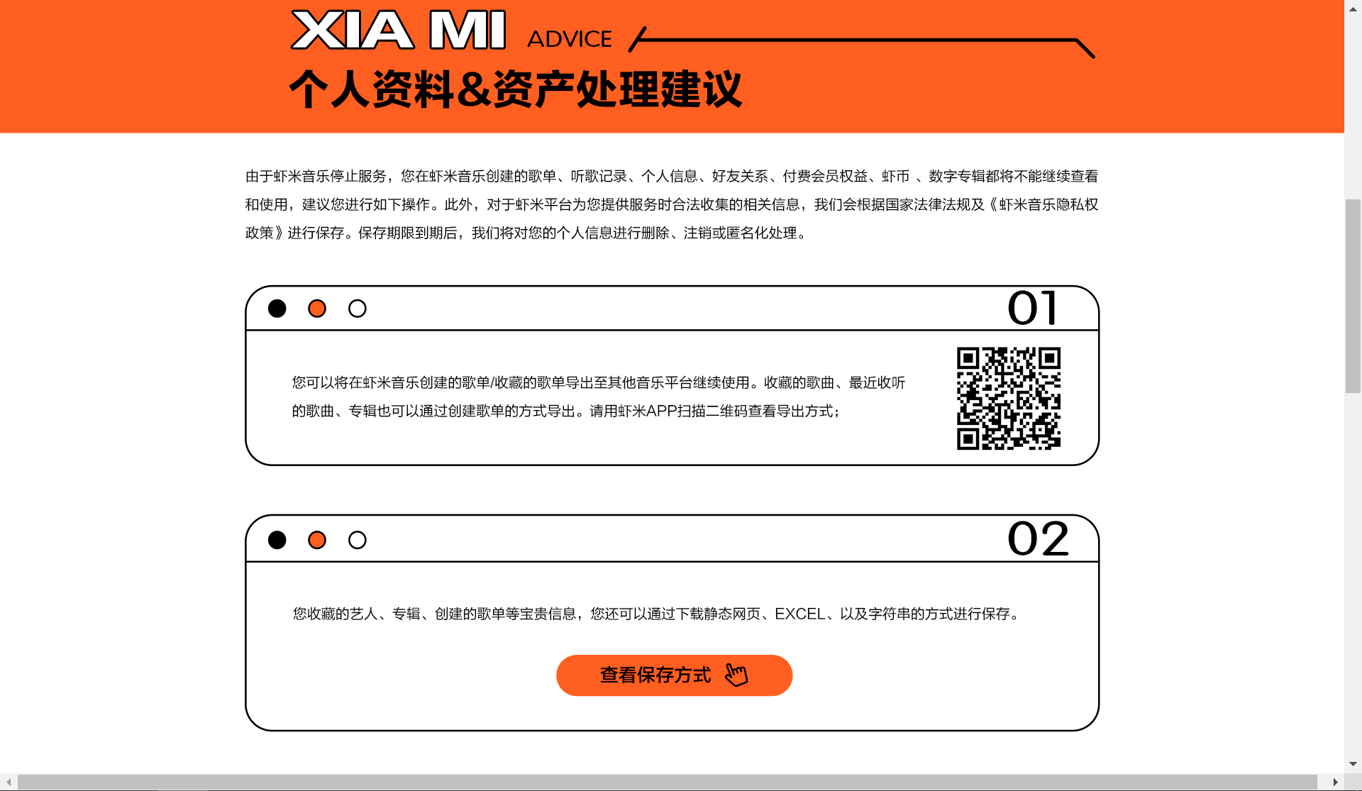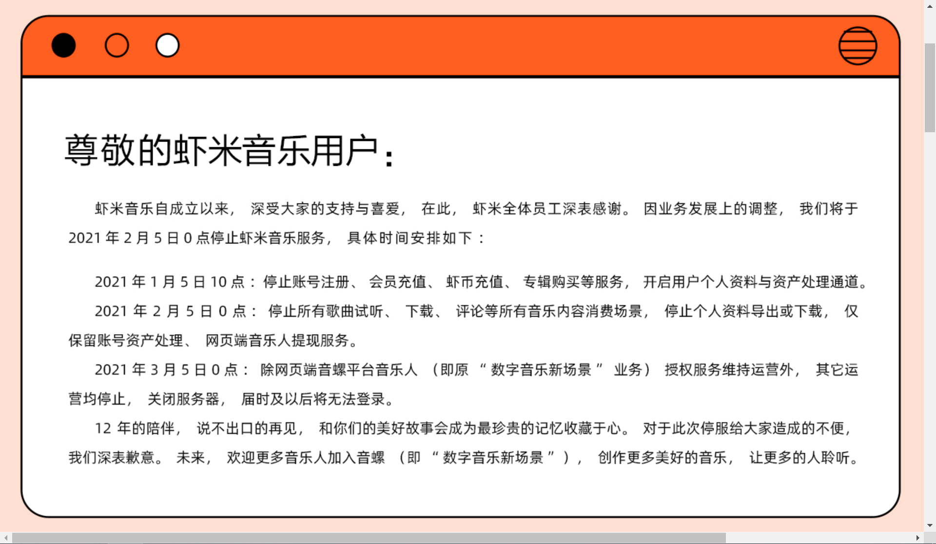 官网显示,用户创建的歌单、听歌记录、个人信息、好友关系、付费会员权益、虾币、数字专辑都将不能继续查看和使用,不过用户可以导出歌单,到其他平台继续使用,包括收藏、最近收听和专辑。用户购买的数字专辑和单曲,可以保存并继续使用。