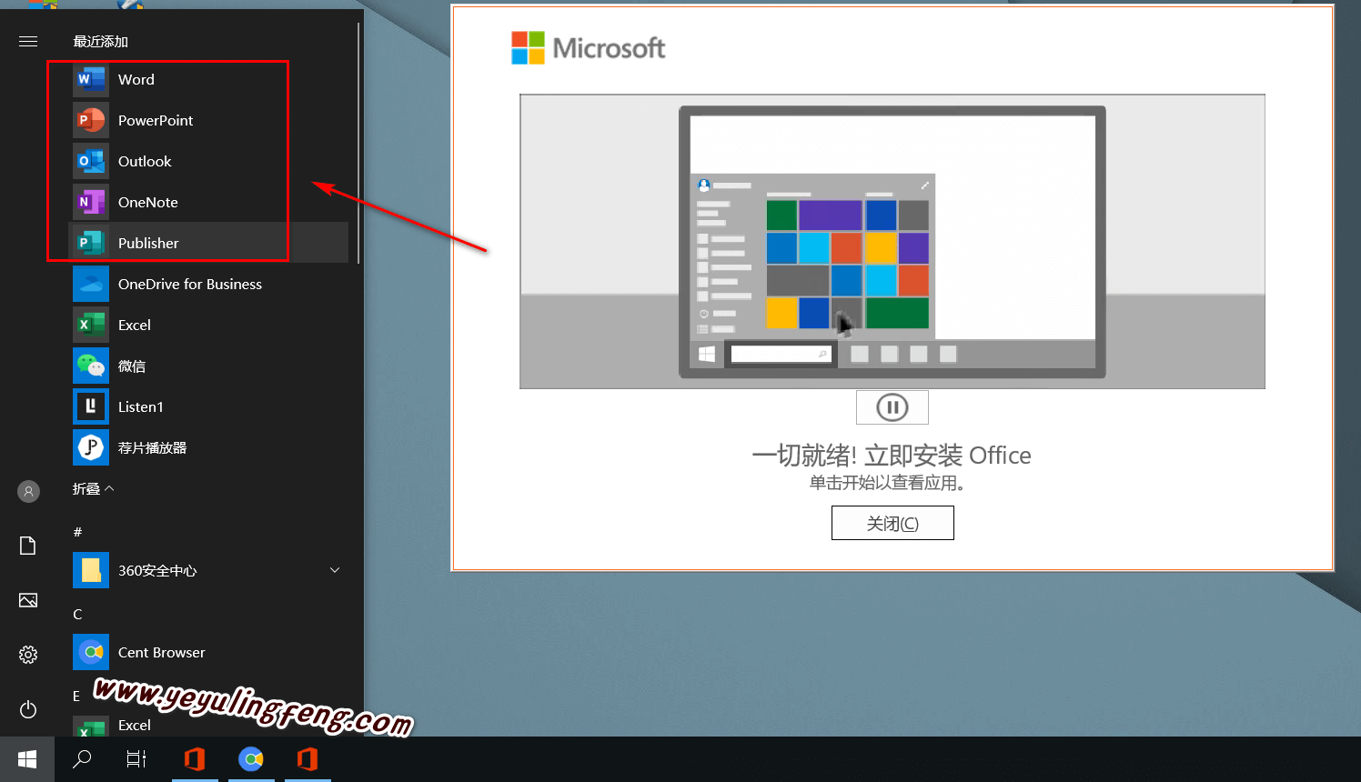 Office安装完成后不会在桌面生成快捷方式的,打开Windows 10的菜单栏就能看到新安装的应用了!如下图所示: