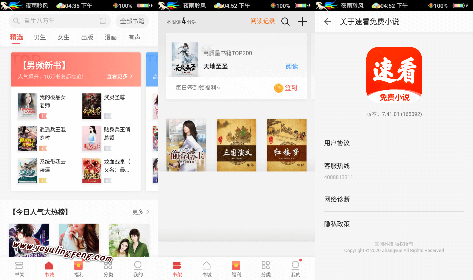 速看免费小说app目前是文字书籍是免费阅读的,但是有声读物是另收费的,目前还没有什么广告,对于那个福利版块签到提示老夜也没仔细研究,如果在软件中能找到你想看的书籍,那么正版的阅读体验还是要优于那些盗版源的,平台承诺小说一直免费,有声会有收费书籍。