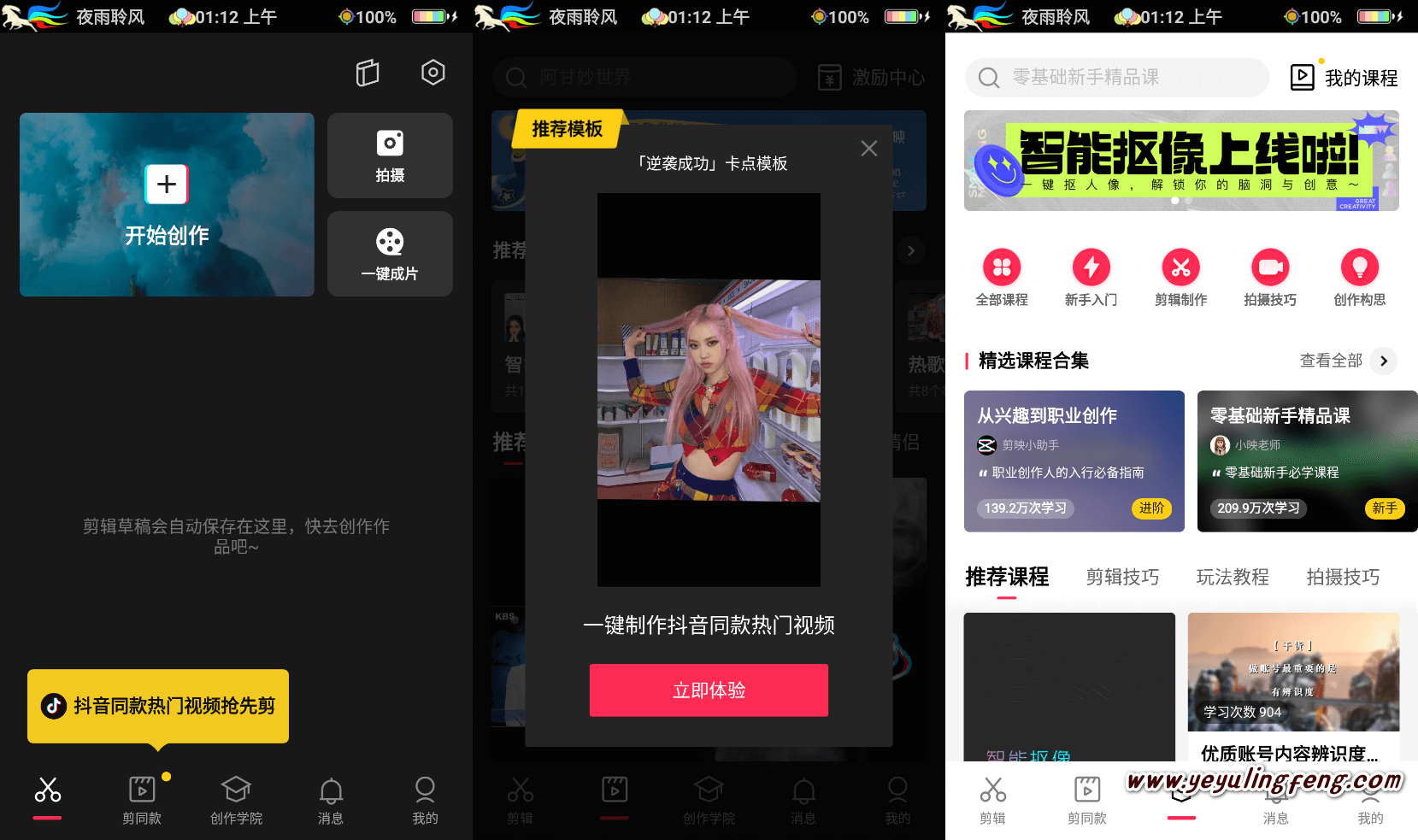 以上就是两款比较不错的国产视频剪辑软件,但是在短视频领域大有作为的字节跳动肯定不能闲着,剪映移动端的推出让许多视频创作者更快更简单的制作自己的短视频分享,无需专业的设备,剪映内置非常多的模板、特效以及创作学院。