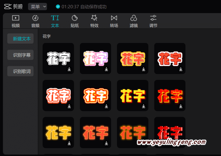 左侧基本上就是素材处理编辑的区域了,包括字幕、滤镜、贴纸、特效等,点击下载后就能直接使用