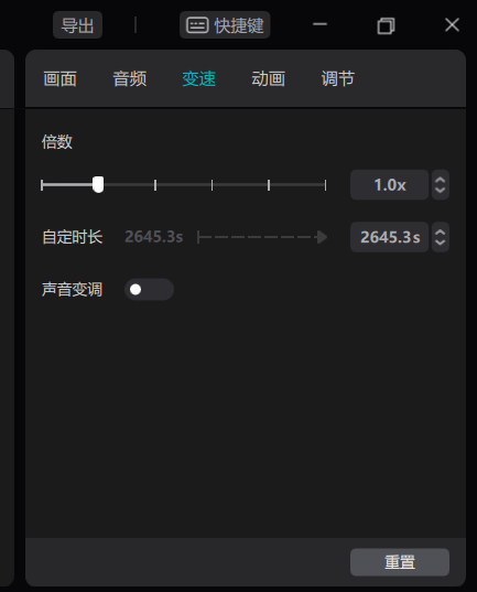 右侧就是视频本身的一些处理功能,包括倍速、变声、以及一些音频动画调节,一键变声老夜用着还是挺好玩的,这下公鸭嗓子也能嘤嘤嘤了