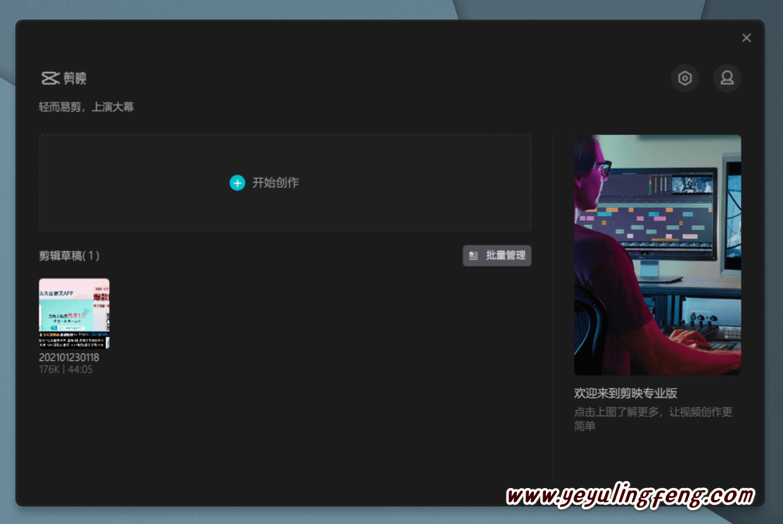 客户端打开后便是如下界面,安装包体积也就200多MB左右,对于动不动就是以GB为单位的专业剪辑工具来说还是比纤小的,当然了内置的一些特效还是需要单独下载使用久了体积占用也会跟着涨