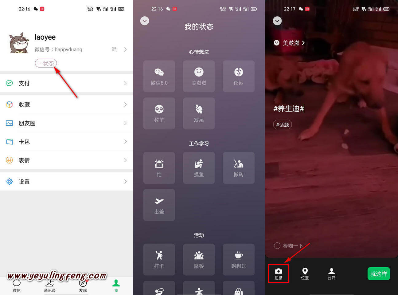 下面教大家如何设置,首先确保更新至8.0版本,然后按下图所示点击状态,在展开的状态中随便选一个点击进入,点击左下角的相机按钮,这里不需要拍照直接导入相册内容就行了,提前将视频文件保存在手机本地就能直接选中设置为状态。