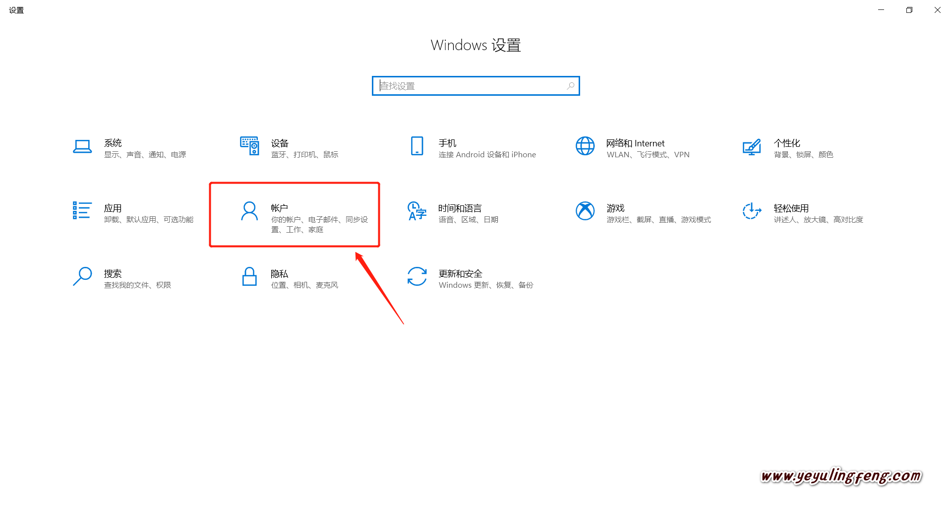 点击“账户”进入账户设置页或者直接Win + Q弹出搜索框后直接搜“账户”就能进入账户设置了