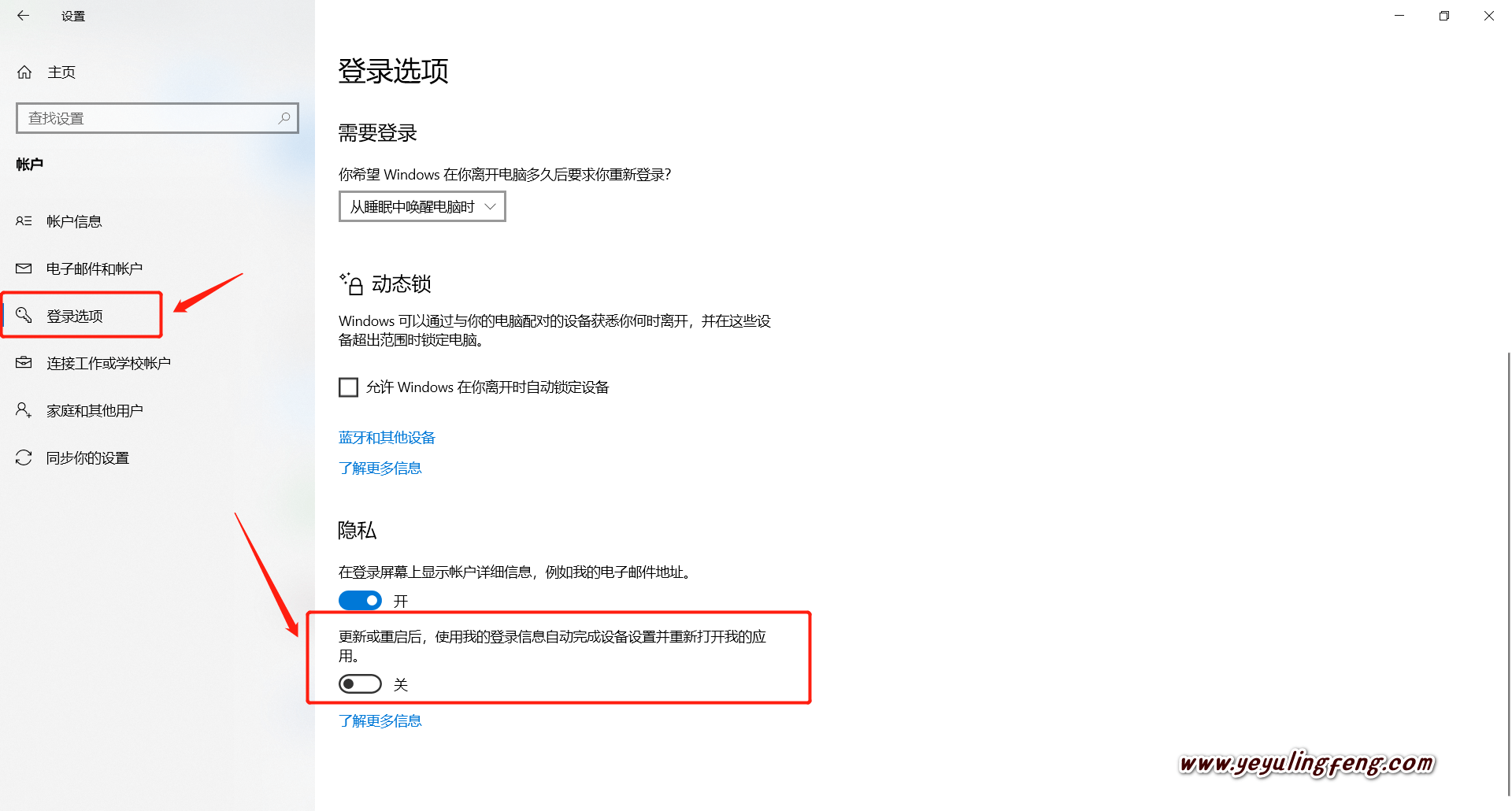 然后按照下图所示,在登录选项中找到“更新或重启后,使用我的登录信息自动完成设备设置并重新打开我的应用”,把默认开启的功能手动关闭就行了
