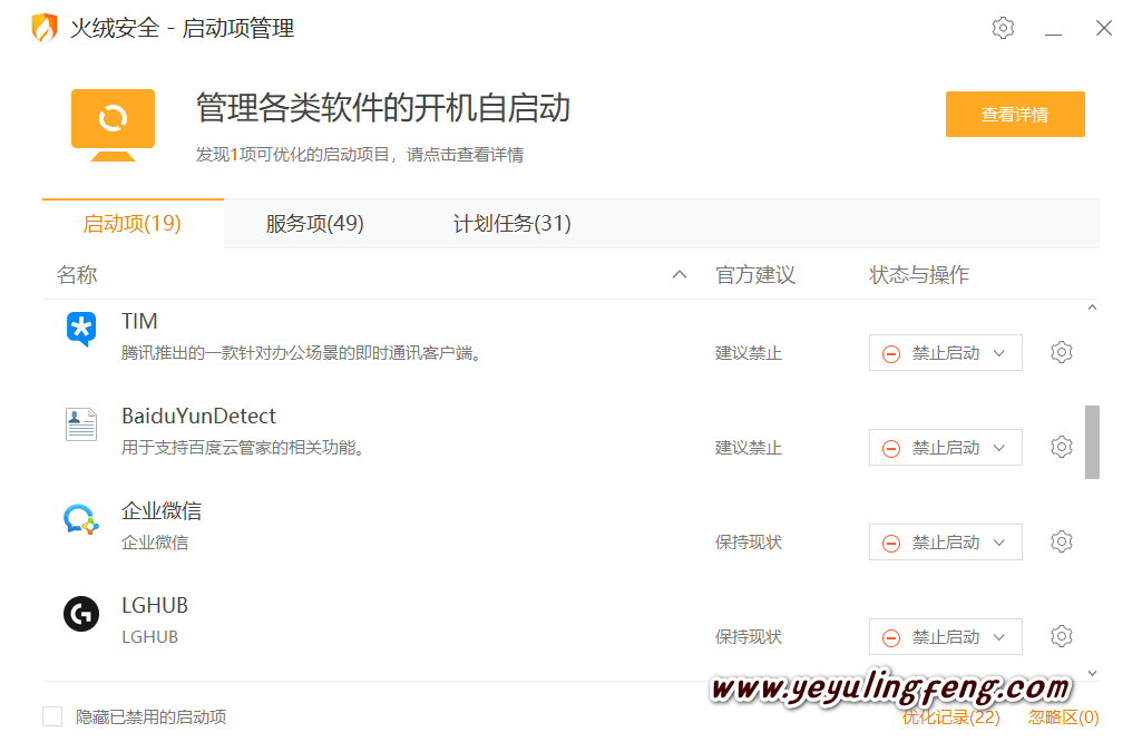 当然了这只是简单的设置,好多情况下安装后的软件默认会开机自启动,大大的拖慢了我们电脑开机时间,对于频繁使用的微信这类软件还好,一些使用频率不高的软件老夜就强烈建议禁止自启,一般小白用户都会选择管家类的第三方工具管理应用自启动,但一些电脑管家自身就是拖慢开机速度的大户,关于电脑管家安全工具这里只推荐火绒安全,能拦截各大流氓软件的自启、捆绑、广告弹窗等,自身占用非常小轻爽无广告。