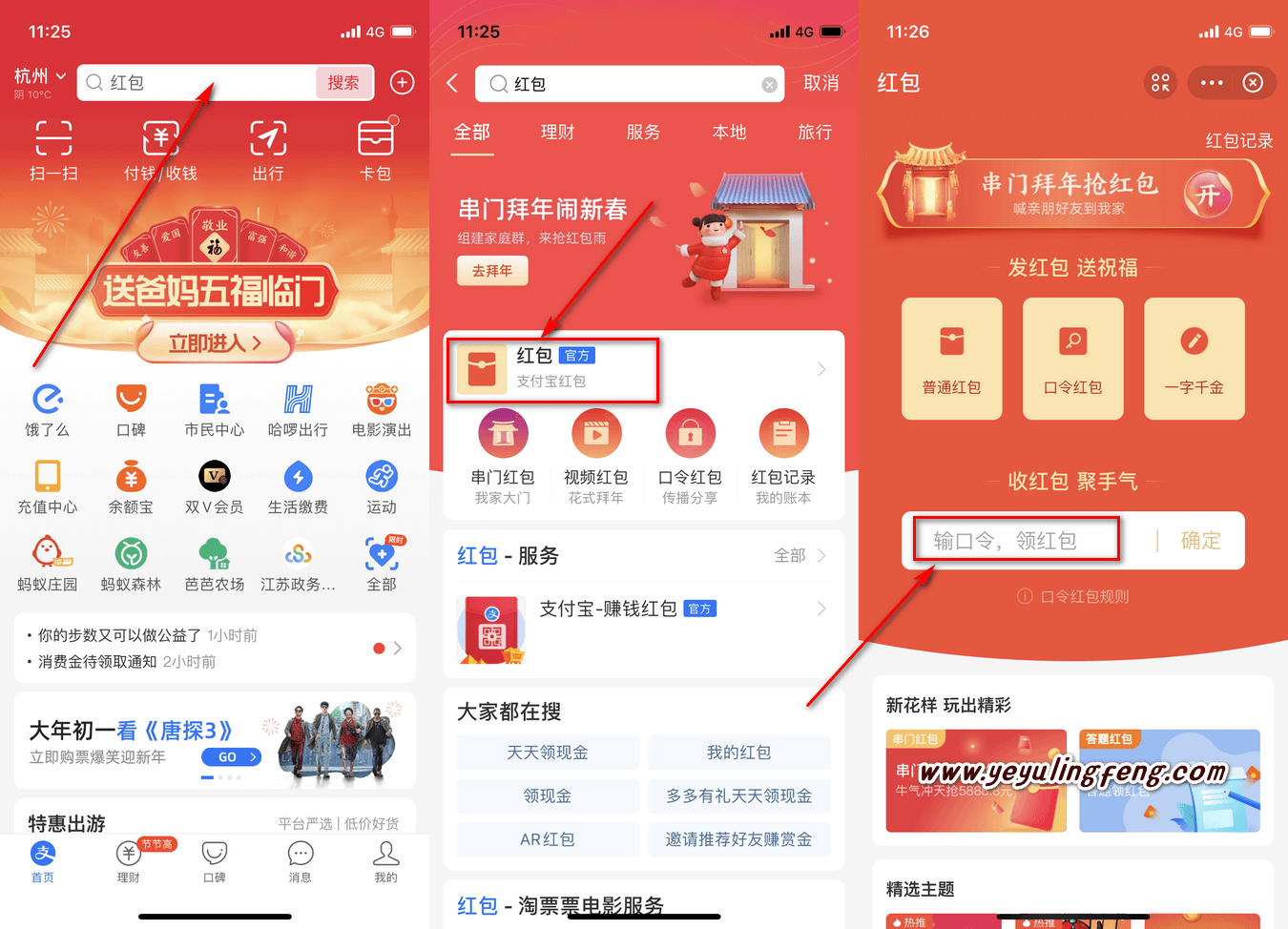 为了能让小伙伴们能在最快的时间内抢到红包,如果先前没用过支付宝口令红包的可以先按照老夜下面的教程练练手,直接手机打开支付宝客户端,首页顶部的搜索框点击进入,搜索“红包”,然后按照下图中点击进入,在口令输入框中输入指定的口令就能领取现金红包了!