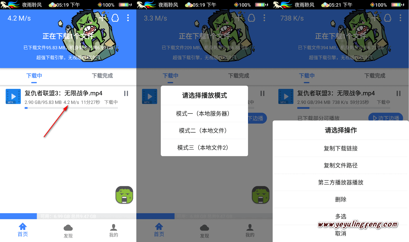 下载时可以复制文件路径、复制下载链接以及调用MX等这些专业手机视频播放器预览