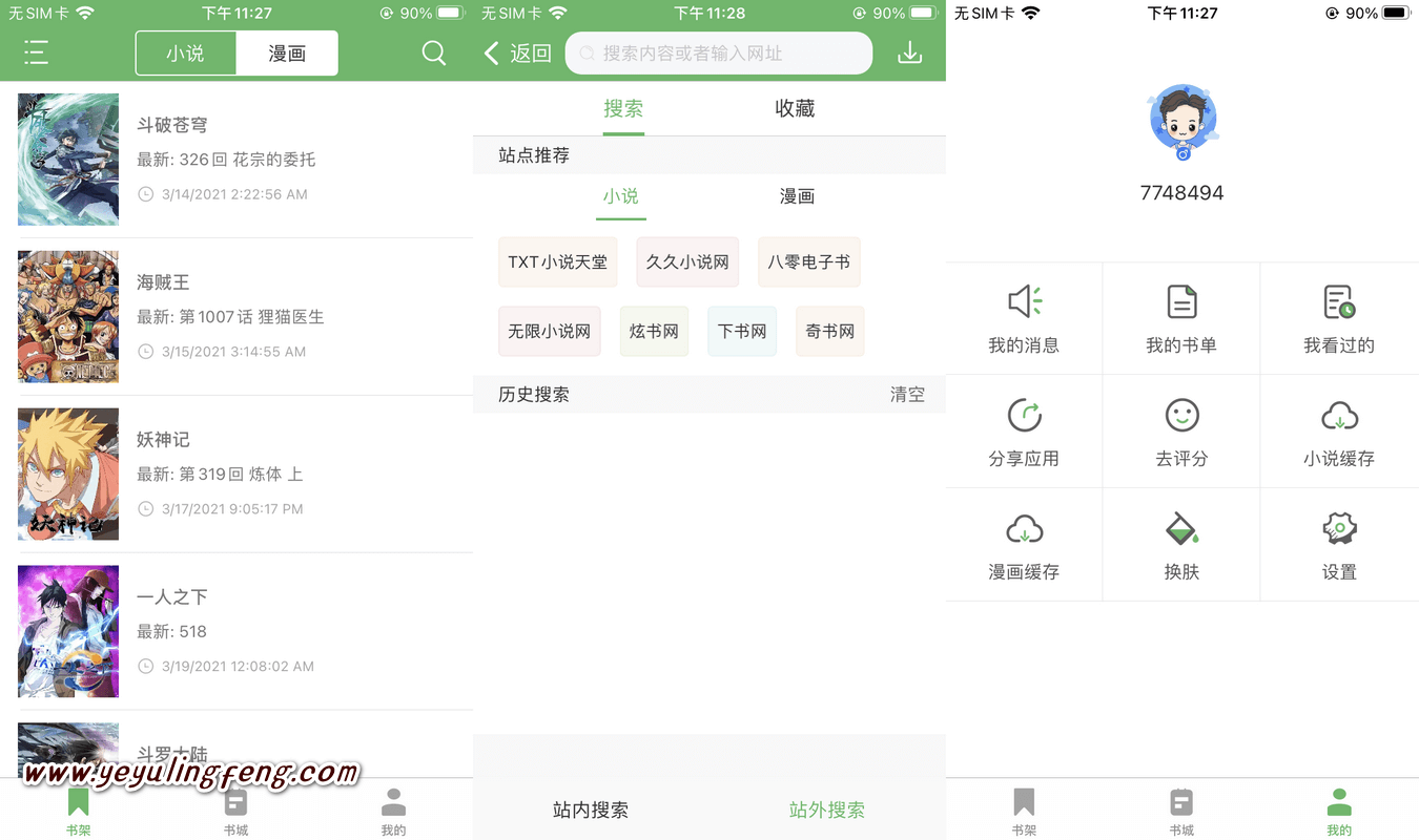 软件小说和漫画都是相对独立的,包括书架、书城、下载以及搜索,搜索功能支持站内以及站外搜索,聚合全网的小说漫画资源
