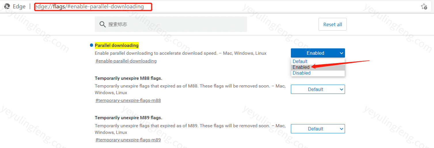 复制后在浏览器地址栏粘贴并回车,就跟平时输入链接访问页面一样,然后我们就进入了全是英文的页面,看到标黄的部分没,将右侧默认的 Default 改成 Enabled 即可,然后按照提示重启浏览器就成功开启了多线程下载功能了。