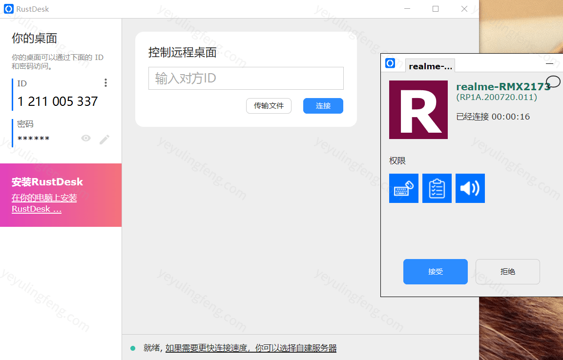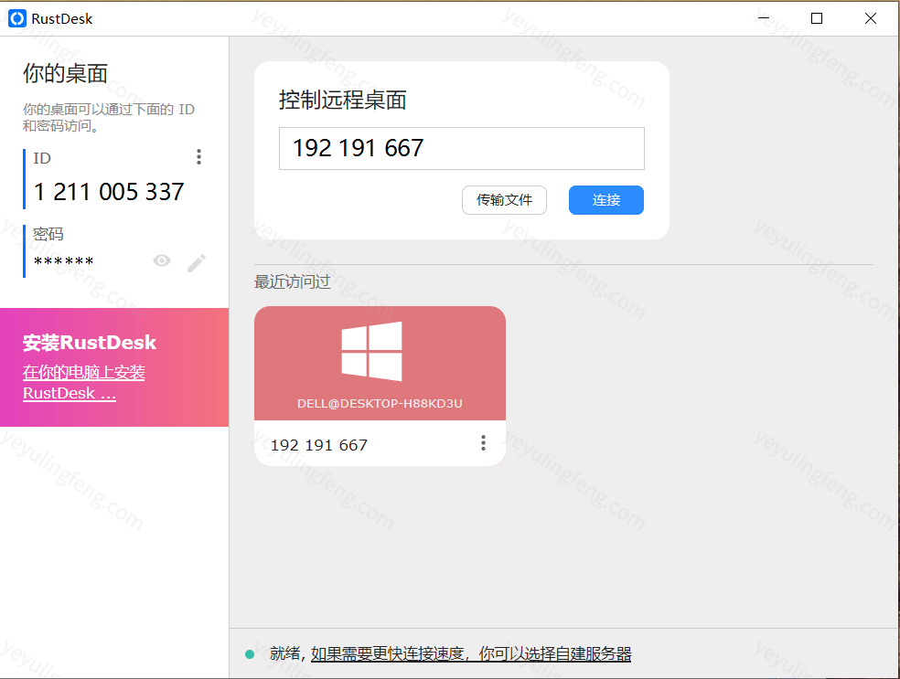 两台设备均安装好RustDesk客户端就可以使用了,Windows端还是单文件免安装的值得好评,这里老夜就拿手机端控制电脑端做过测试,同时也尝试远程过公司的电脑,出了轻微的延迟以外其他地方应该是不属于同类产品了。记录本机的远程连接ID以及随机的密码,密码可以自定义设置固定的方便无人值守时远程。
