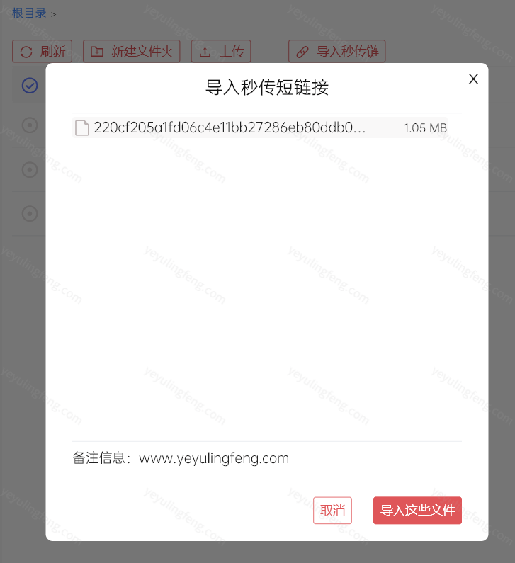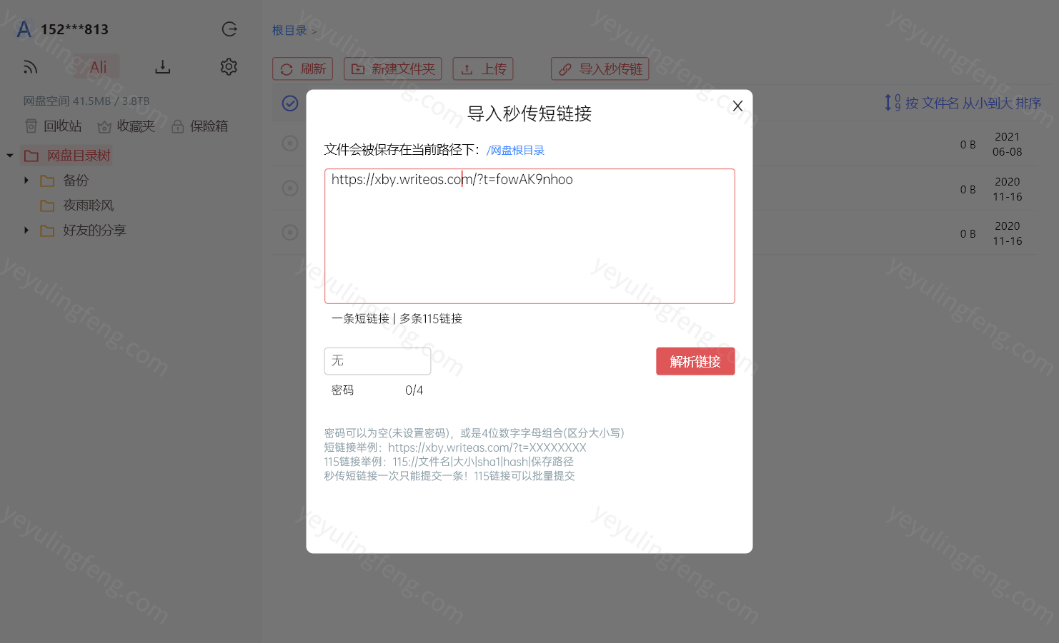 生成分享链接后就可以分享给其他用户了,当然又一个前提就是对方也必须要下载小白羊版客户端,然后找到“导入秒传链”将获得的链接粘贴进去就能解析保存至阿里云盘内了。