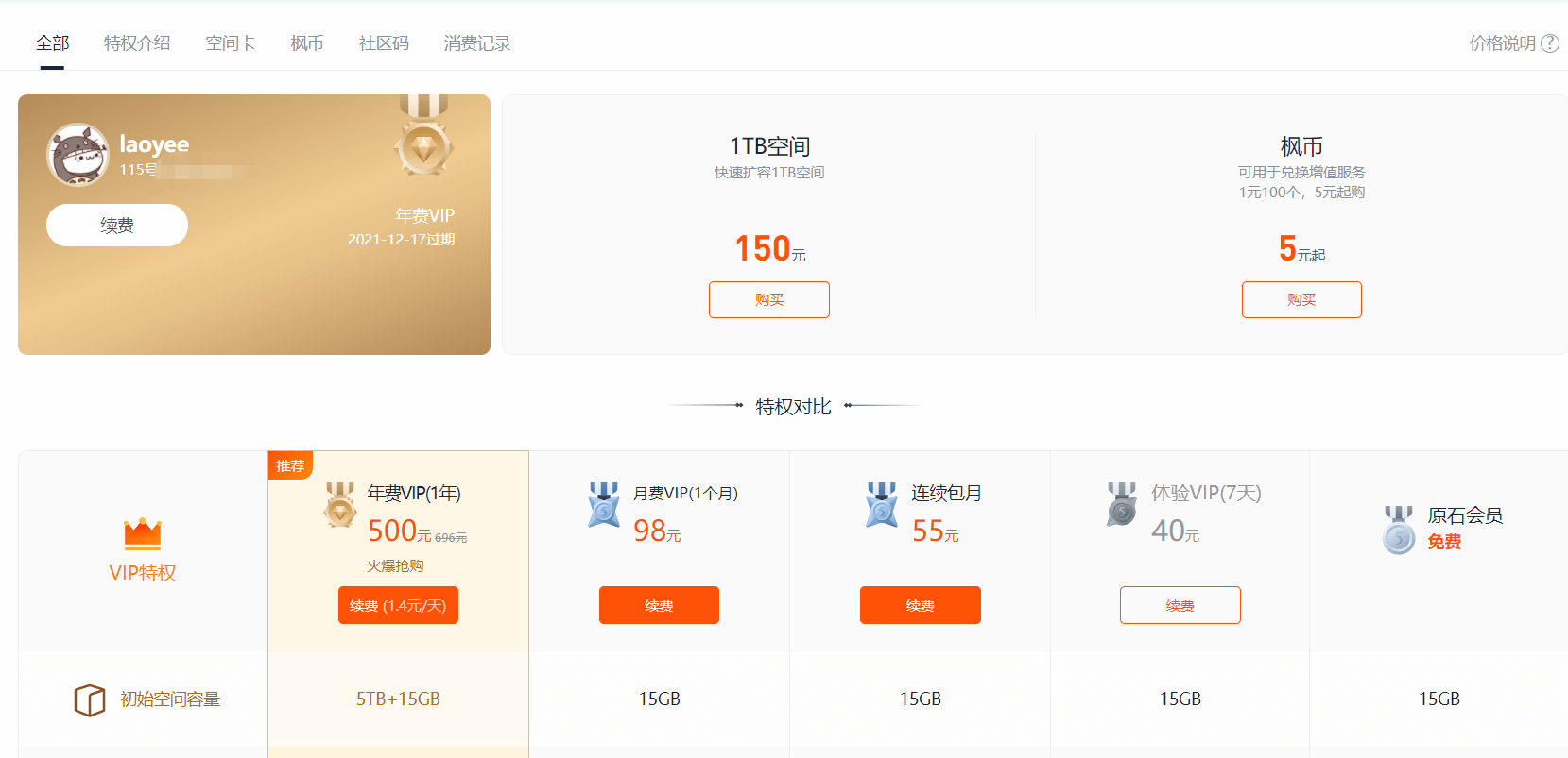 115网盘的长期价格均是500一年,这次1500即可享受11.5年的会员时长还是挺香的