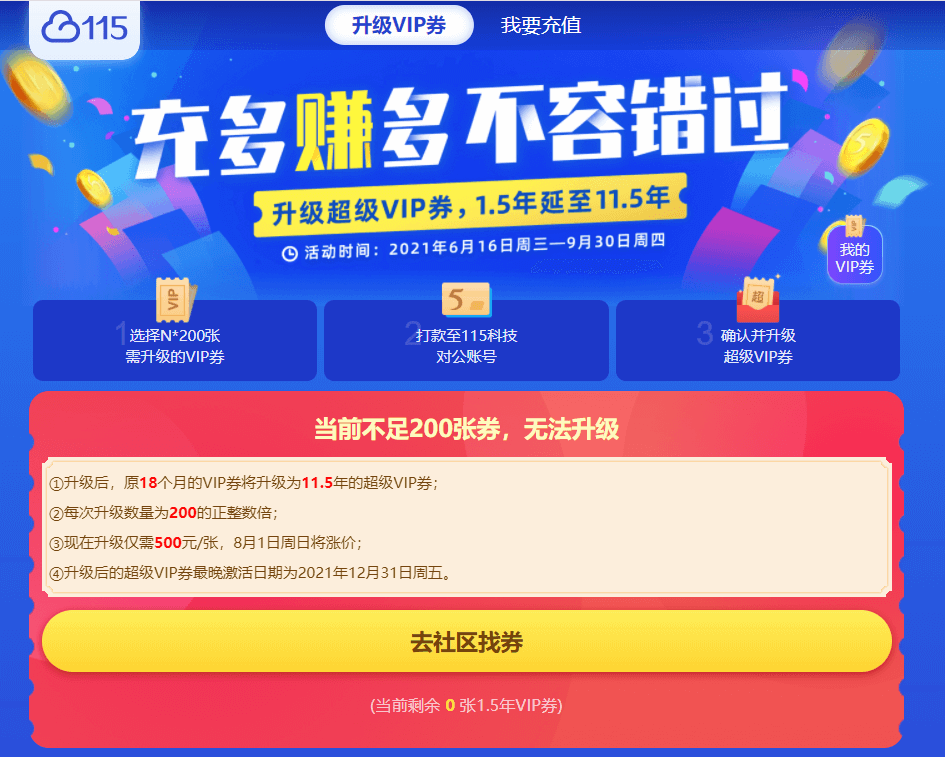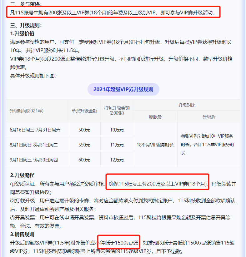 凡115账号中拥有200张及以上VIP券(18个月)的年费及以上级别VIP,即可参与VIP券升级活动,所有参与用户须经过资质审核,确保115账号上有200张及以上VIP券(18个月),且升级后的超级VIP券(11.5年)对外售价应不得低于1500元/张