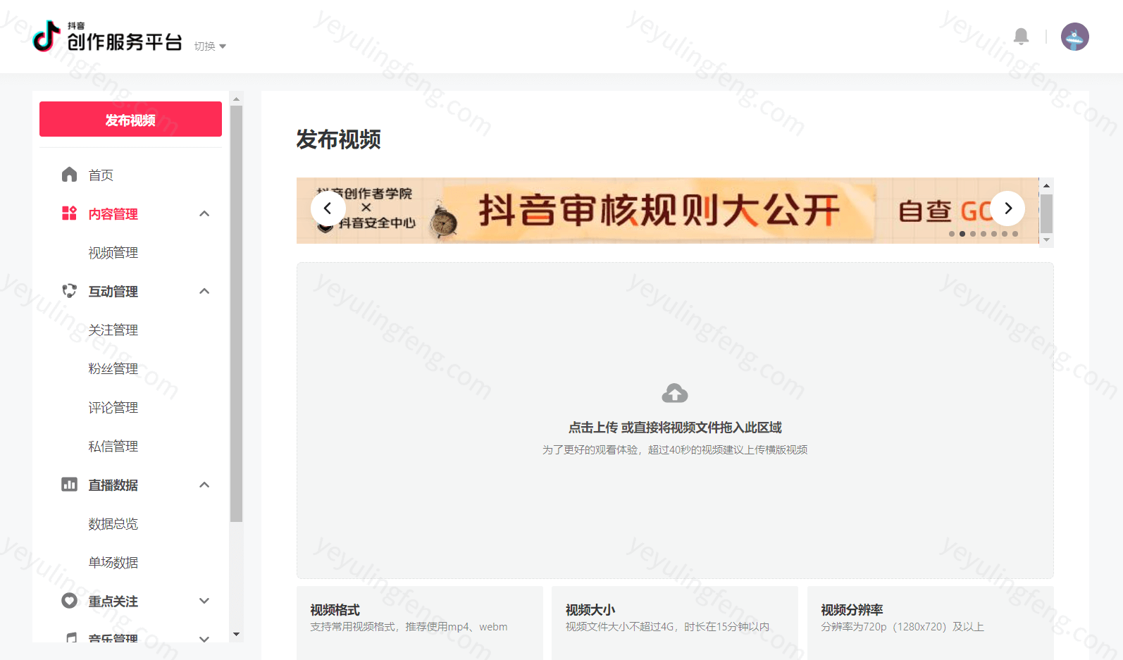 如果是一名短视频创作者还可以通过网页版上传自己加工处理好的视频发布,内容管理、互动管理、数据分析等都比较齐全,后台排版与老夜平时接触较多的公众号管理界面类似。