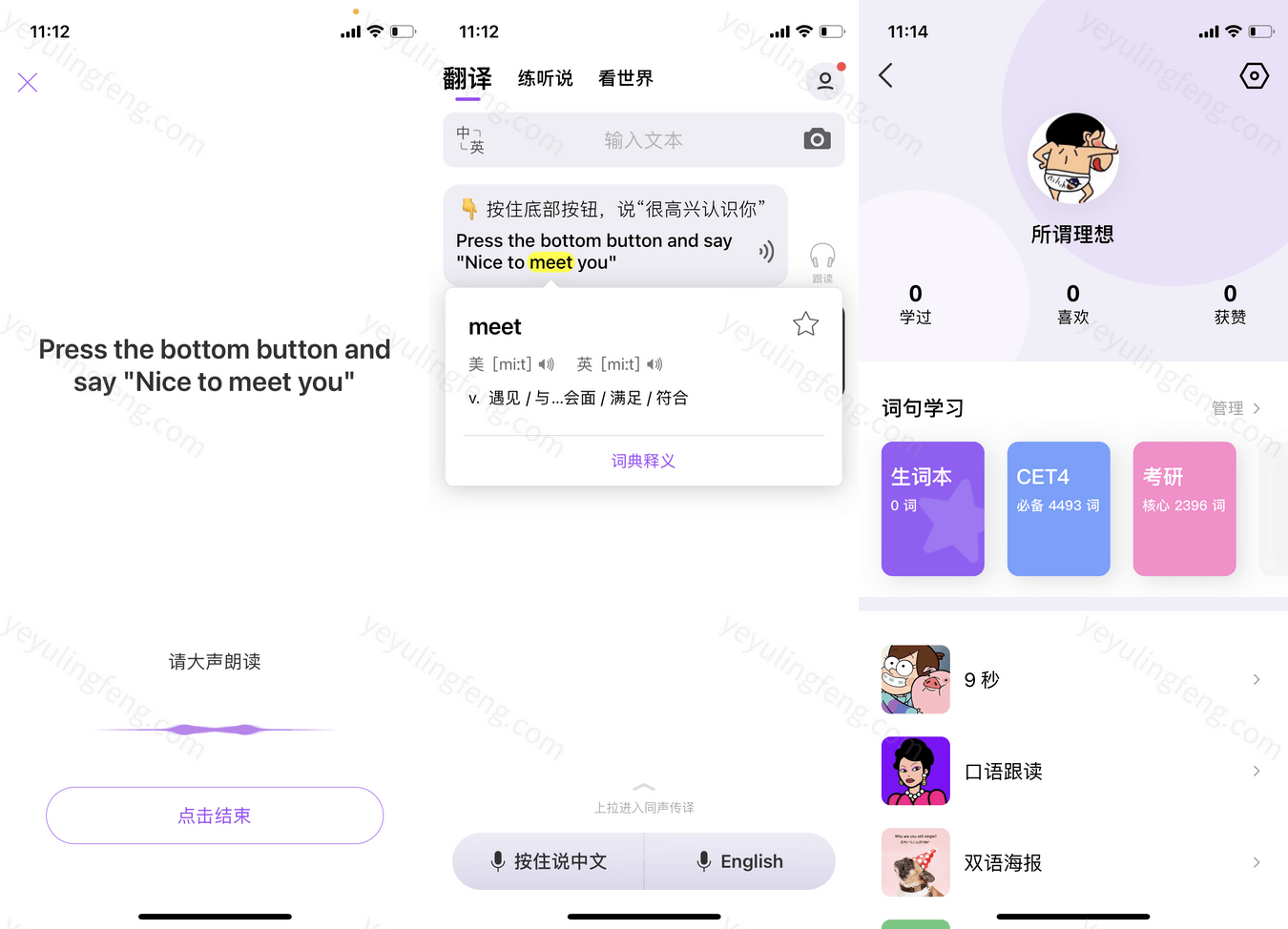 腾讯翻译君的定位不仅仅是翻译工具,同时也是训练英语听说读写能力的综合辅助学习工具,可以添加一些词汇进行学习背诵,还有词汇跟读功能,系统会自动检测你的发音准确,对阅读读音进行打分(1-5星),并标出非标准的词汇,用户可以根据标准读音进行对比。