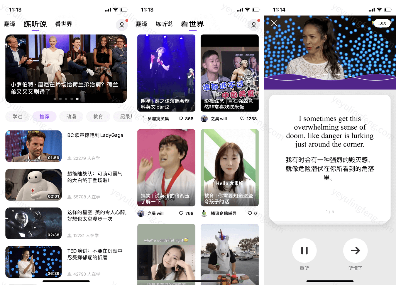 坚持学习一段时间后,如果感觉自己行了就可以去“练听说”、“看世界”版块看看纯英文的视频打击打击下自信心了,没戳,非常的银杏化!