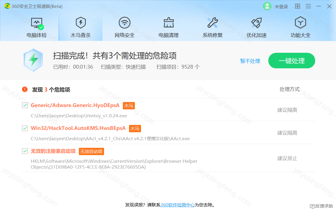 关于杀毒效果这个也不好测试,360在安全领域耕耘这么多年病毒库更新的还是挺频繁的,至于防御效果肯定是有些的,但是个人认为养成良好的上网习惯不轻易点击未知链接、邮件,不乱下载安装软件,比所有杀毒软件都好使。这里吐槽的就是360基本上把激活工具、装机工具清一色的归类到存在安全隐患的文件了,直接就提示删除!