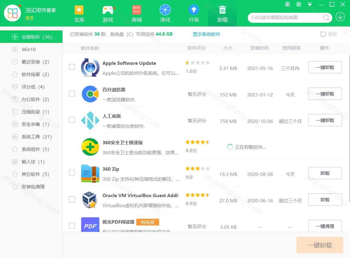 最后有一点还是值得夸夸的,老夜测试完毕看到360软件市场突然灵光一现,在软件管理中发现居然能卸载360安全卫士,整个过程一点都不拖泥带水卸载完后原本安装附赠的软件市场也没了,妙啊!