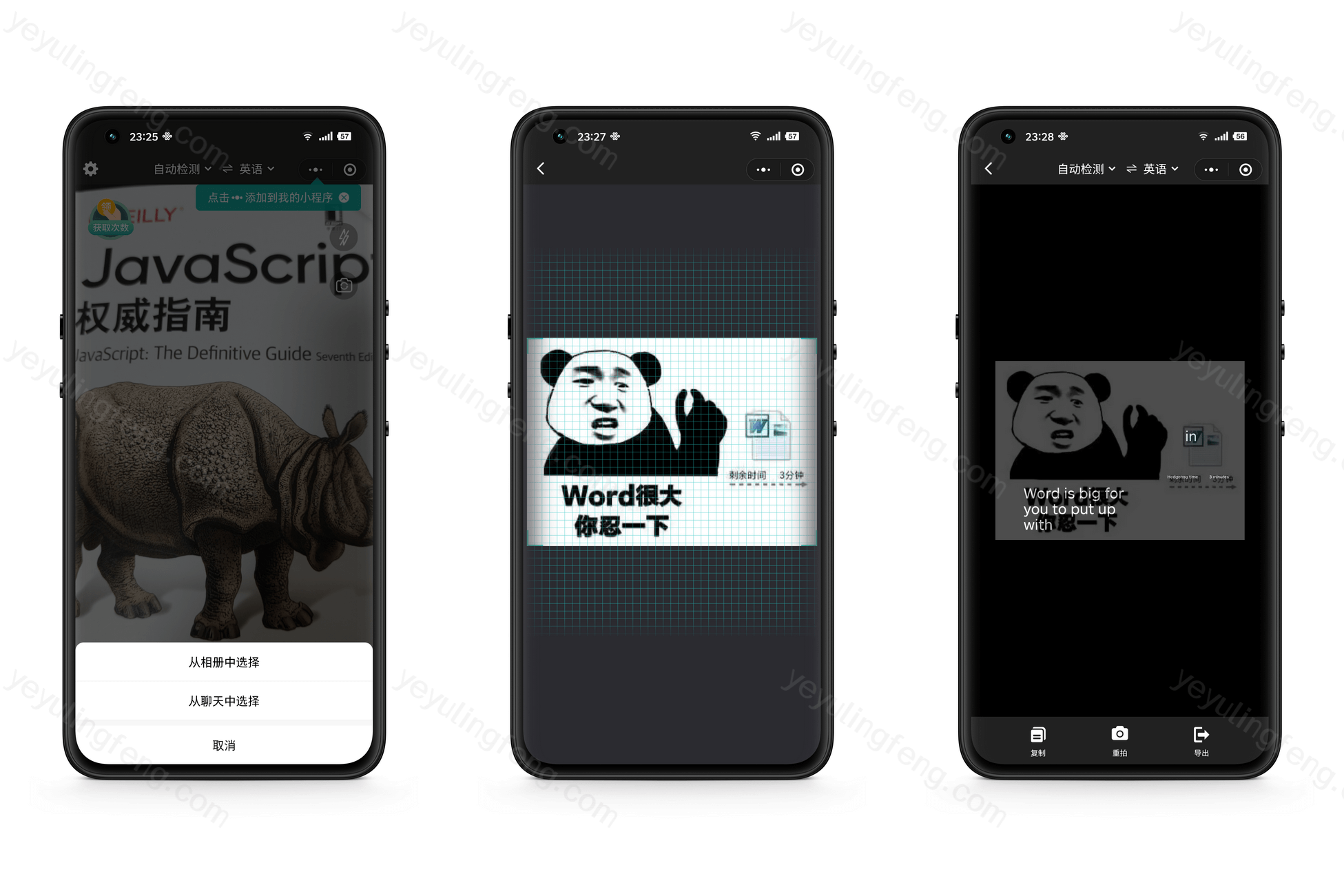 除了拍照识别以外还支持本地图片以及从聊天中选择群聊或者联系人,将记录中的图片选择进行识别