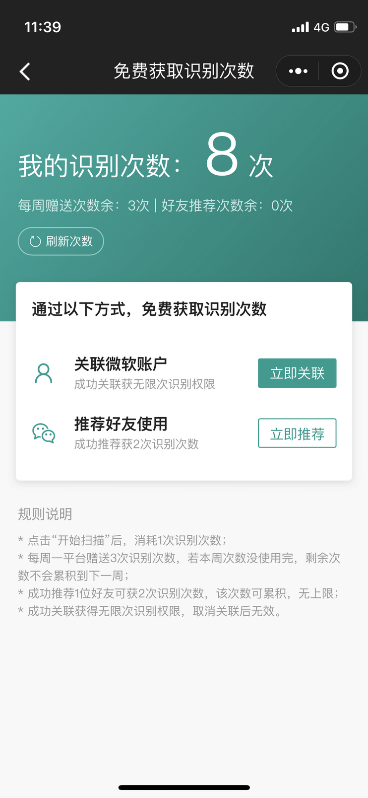 不登录的情况下每周只能赠送识别次数3次,可以直接绑定微软的帐号就可以永久不限制次数使用,或者推荐好友以获得更多次数,微软的帐号注册很简单推荐直接绑定关联。
