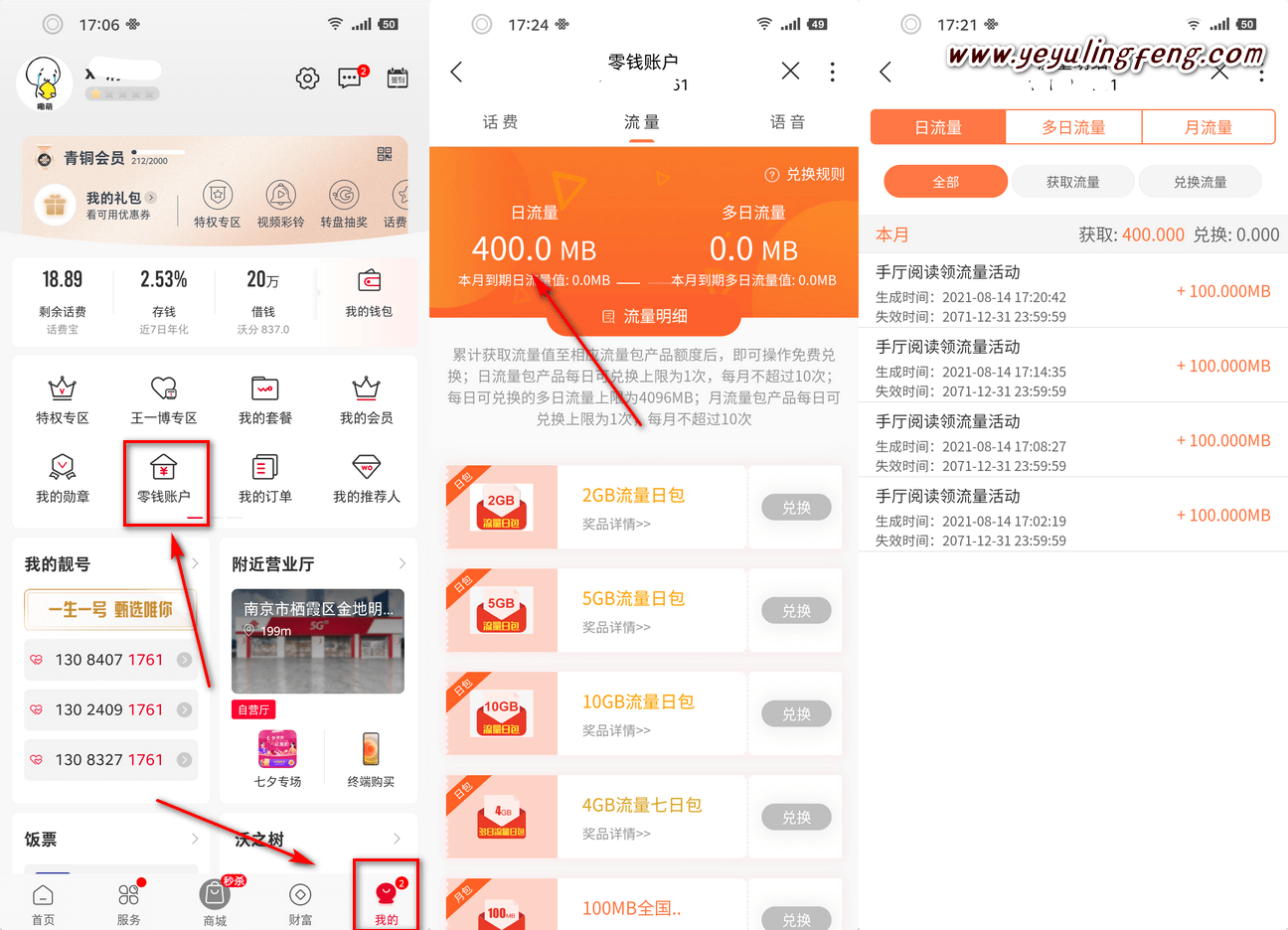 3、流量需手动兑换,兑换流程:联通App->我的->零钱账户->流量