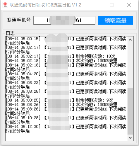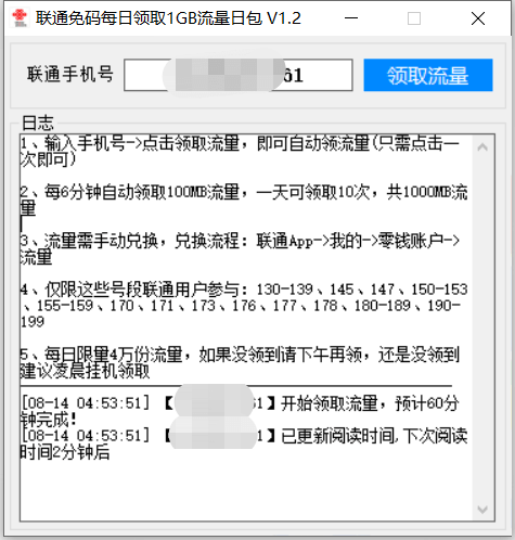 看这软件名字大家都知道是干什么的了,使用操作同样很简单,输入号码后直接点击领取,工具挂后台就行了,每6分钟完成一个任务每天可领10次加起来就是每天1000MB