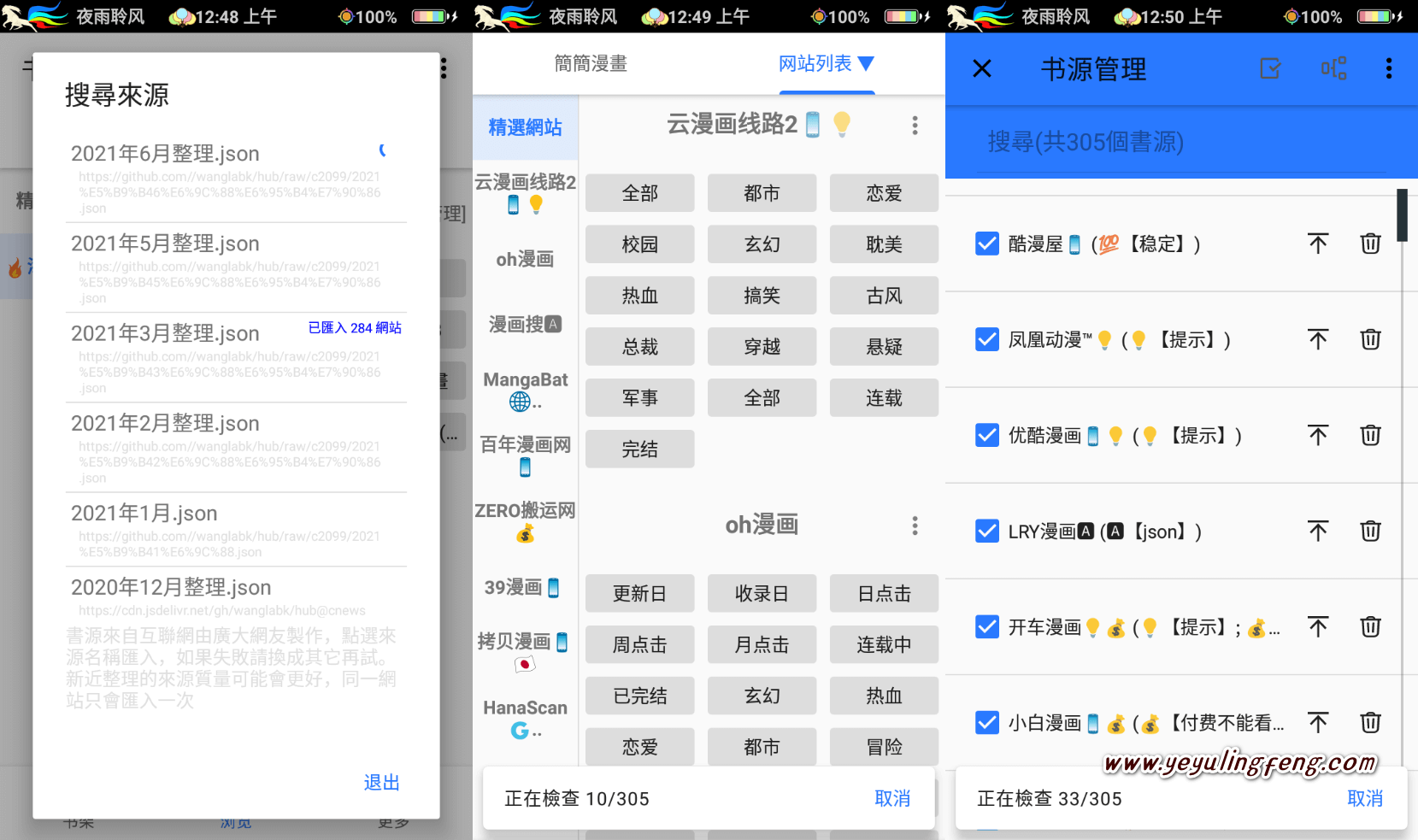 点击右上角就能搜寻添加一些网络上网友整理的源了,可以一键自动添加,添加后就可以管理书源,动手能力强的甚至可以将平时珍藏的漫画网站制作成书源导入到软件中