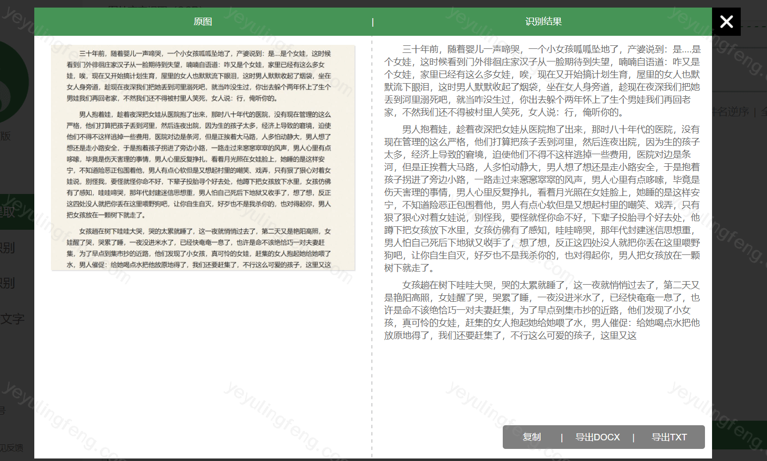 然后就是测试识别效果了,为了对比这里都使用同一样的识别内容,眼睛尖一点的小伙伴已经发现几个识别异常的文字了,不过整体还算不错稍微修改下就能使用。