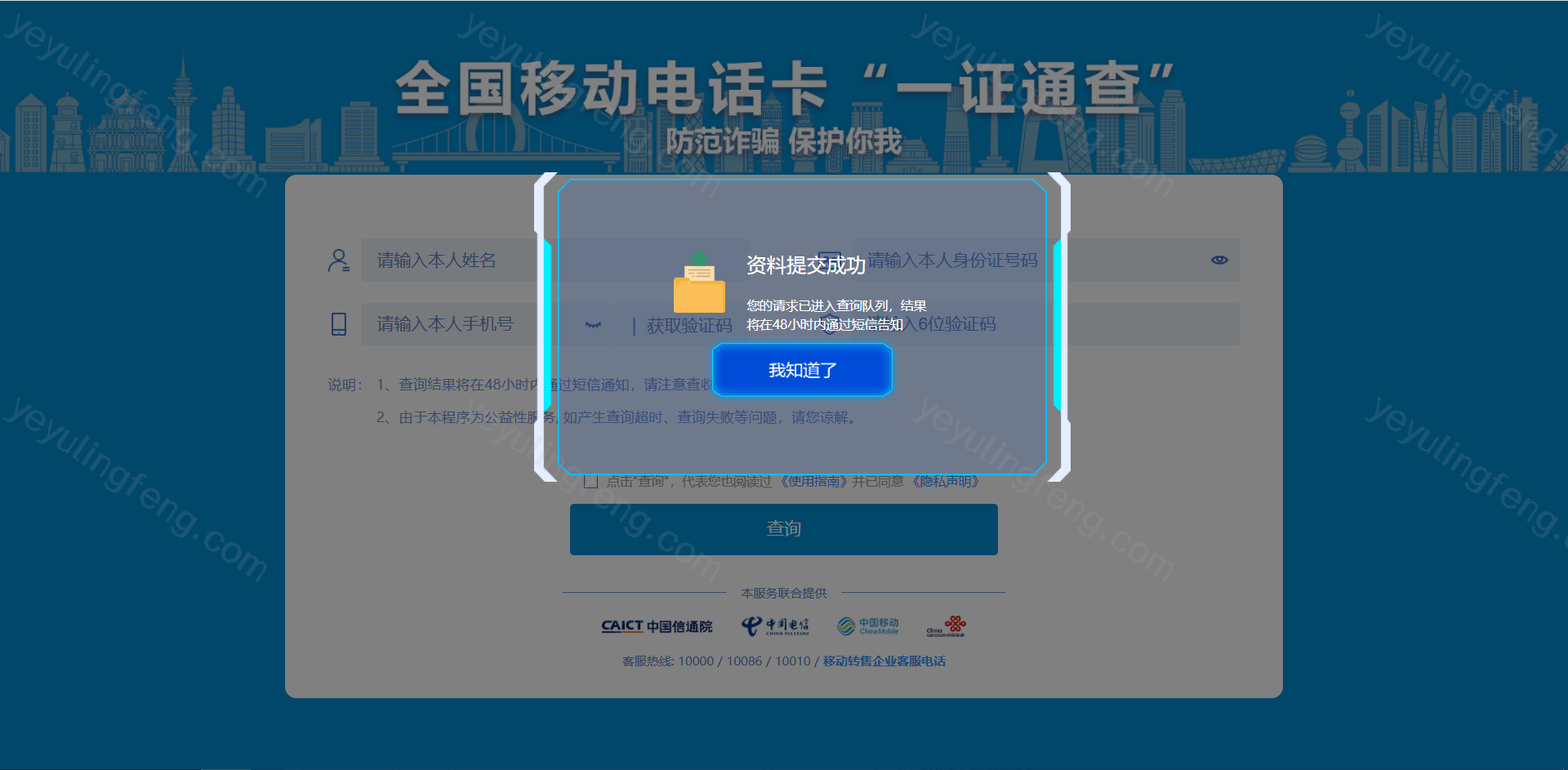 打开浏览器进入中国信通院官网https://getsimnum.caict.ac.cn查询,输入二代身份证号码、姓名、手机号码以及接受验证码,提交后一般2分钟内就能收到附带结果的短信了,这里注意一下结果并不会在网页中展示而是通过10699000统一的短信端口回复用户查询结果,随时留意新接收的短信内容。