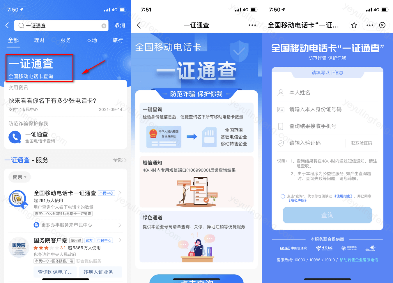 打开支付宝搜索“一证通查”,点击下图中所标注的地方就能进入快速查询了,操作方式与上面一样,输入二代身份证号码、姓名、手机号码以及接受验证码,坐等10699000的信息