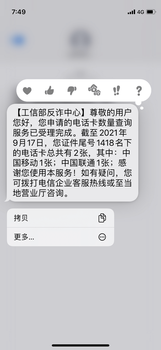 注:查询结果仅包括在网状态的移动电话卡数量,不包括固定电话,以及已销户的移动电话卡。