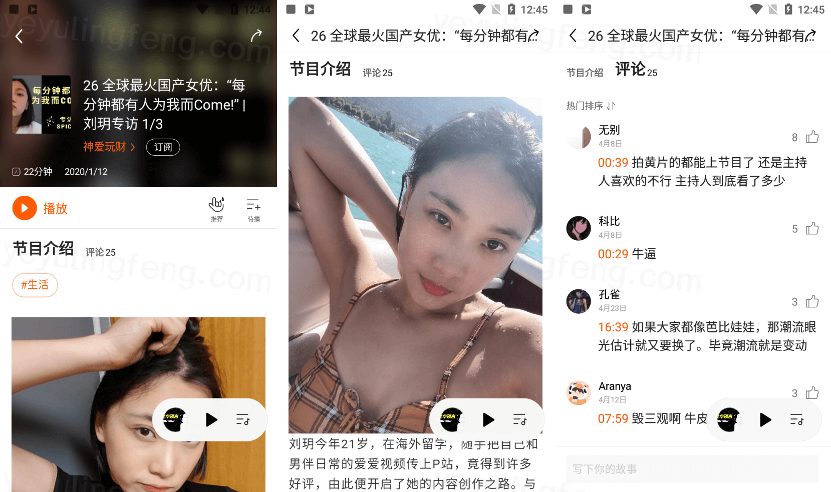 点击某条就能进入播放详情页了,不仅有节目介绍还能快速查看作者的主页以及分享给他人一起聆听,相同的感触让人惊喜,不同的意见带动思辨,还可以添加评论发表对当前内容的看法与一群人交流