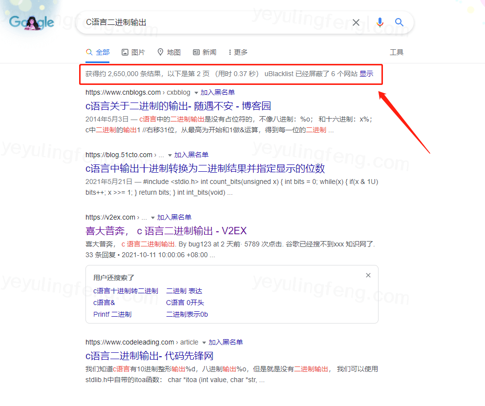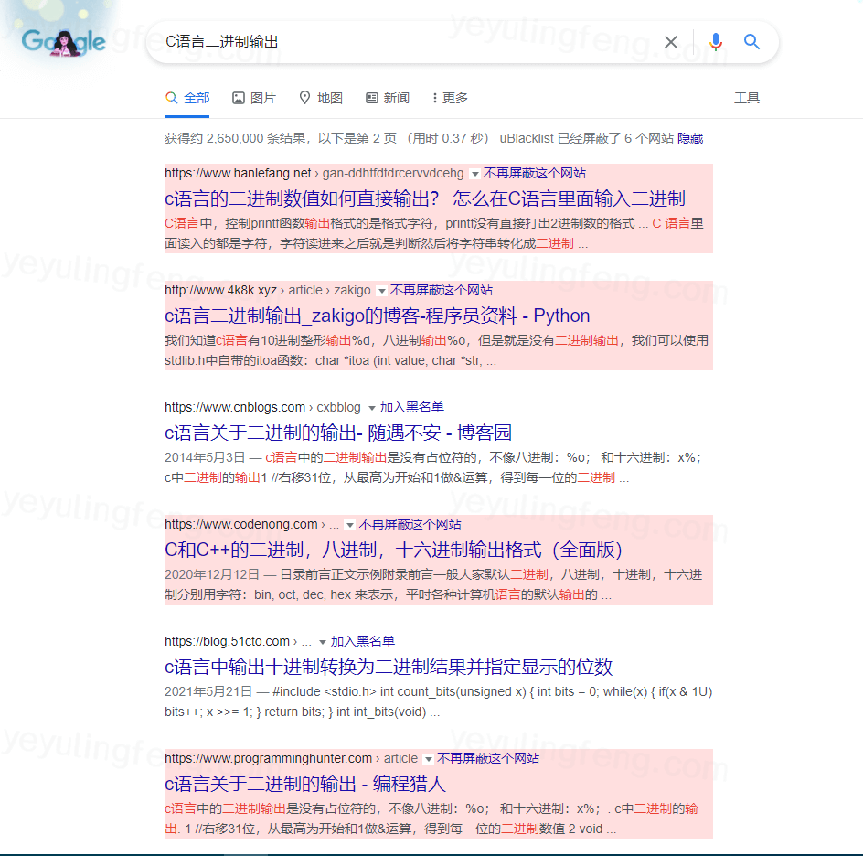 然后我们重新搜索之前小X百科网、小X知识网泛滥的关键字,就明显的看到内容清爽多了,uBlacklist的功能仅仅是将那些符合拦截条件的搜索结果折叠不显示,对于其他的一些搜索结果不满意也可以点击标题右侧的“加入黑名单”就行了
