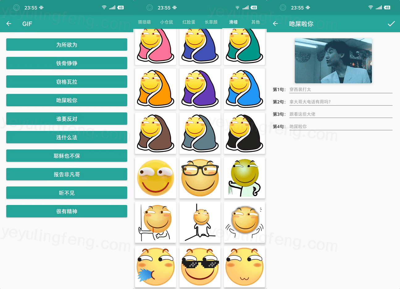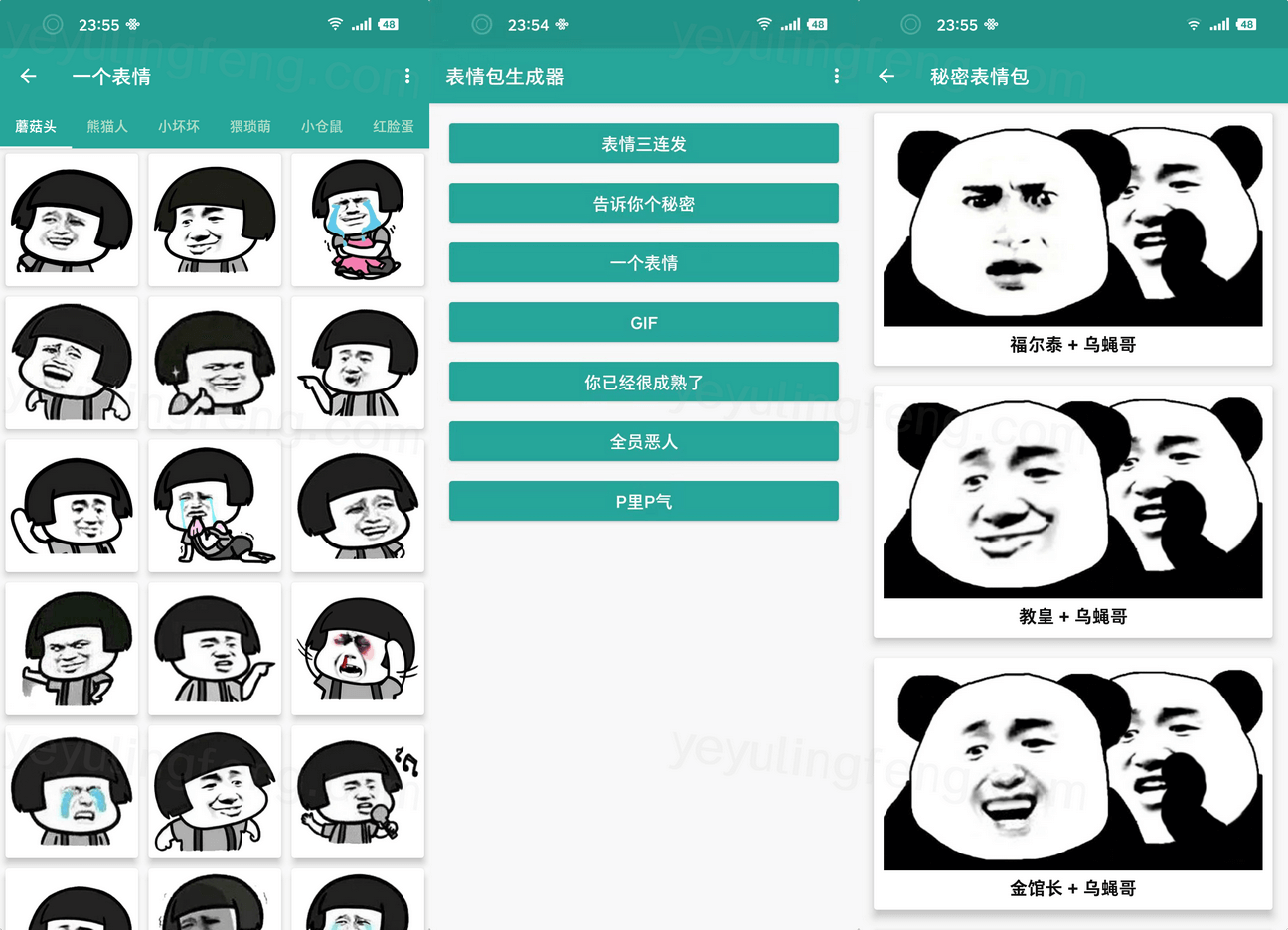 这款骚气的工具目前也只有Android端,使用全程没有广告断网也能使用,自带各种魔性的表情包为创作模板,而我们只需要动动小手加点文字内容或者拼接就ojbk了