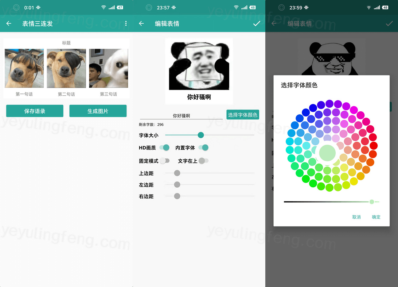 金馆长、熊猫头、学友、非凡哥等斗图界的翘楚都能一键快速的制作出图了,而且对于编辑的操作性也是非常的灵活,字体颜色、大小、边距、尺寸裁减,生成完毕后就可以保存在手机本地