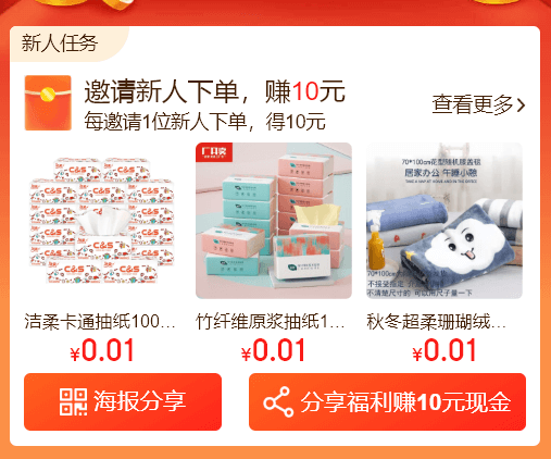 如果是老用户就不能享受1分钱购了,老夜两个手机号之前都用过了这次也是一样都没捞到,但是老用户可以在京喜小程序上申请自己的推广海报或者链接分享给别人,拉一个新用户就赚10元。拉来的新用户同样能直接1分钱买买买,因此推广还是非常容易的