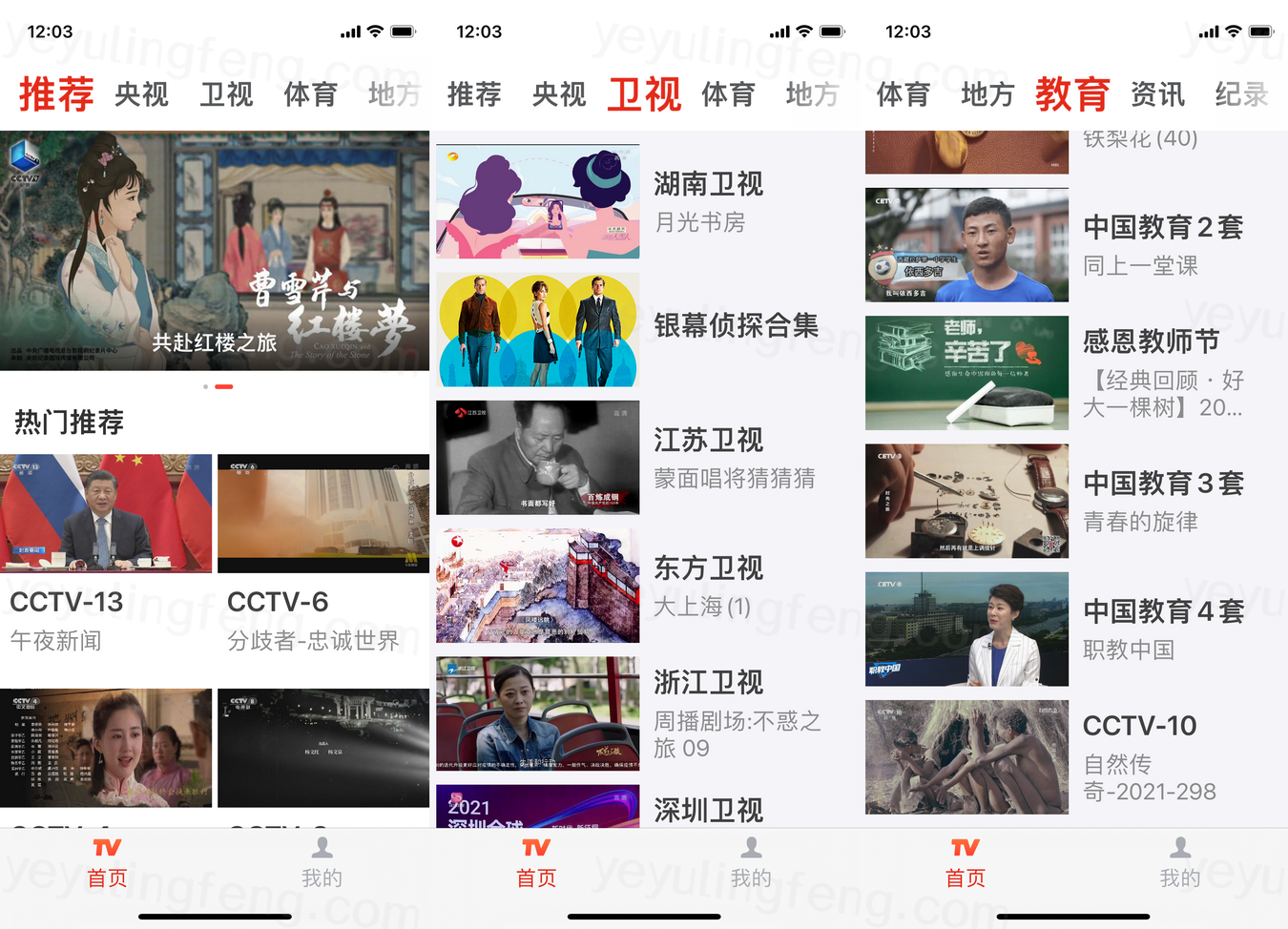 央视:包含CCTV1、CCTV3、CCTV4、CCTV5、CCTV6、CCTV8、CCTV13、CCTV16、CCTV地理、CCTV-News、国防军事、海峡两岸、证券咨询、音乐综艺,央视一套到央视十七套,你想看的央视直播、新闻联播、财经新闻、法制节目,体育竞赛这里全都有!